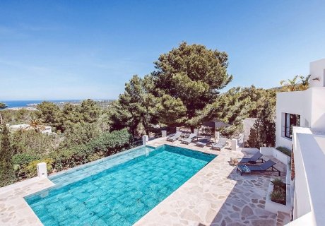 A relaxed 5-bedroom retreat near Cala Tarida, Ibiza, offering panoramic sea views, a private pool, and easy access to stunning beaches.