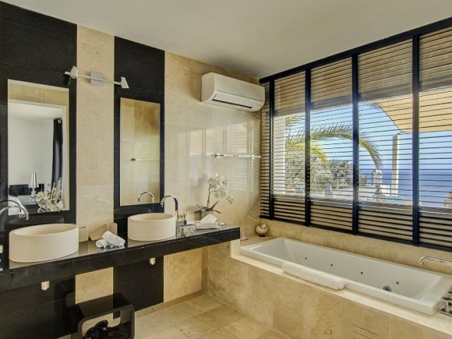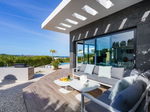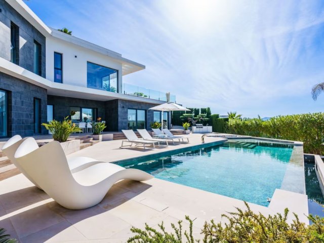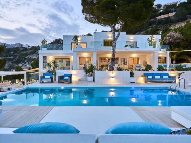 Luxury 4-bedroom villa for 8 guests with private pool, hot tub, landscaped garden, terraces, BBQ, A/C, WiFi and beautiful views near Arenal Beach and Moraira.