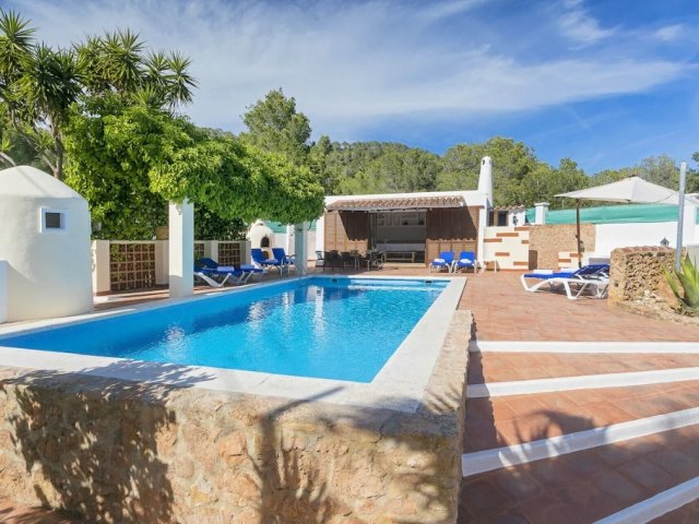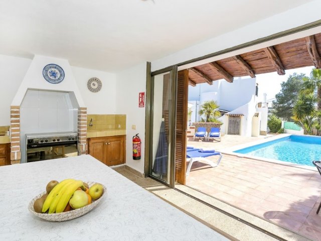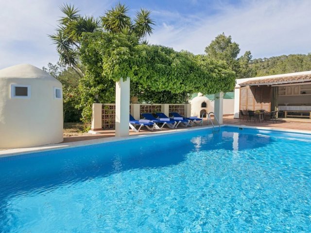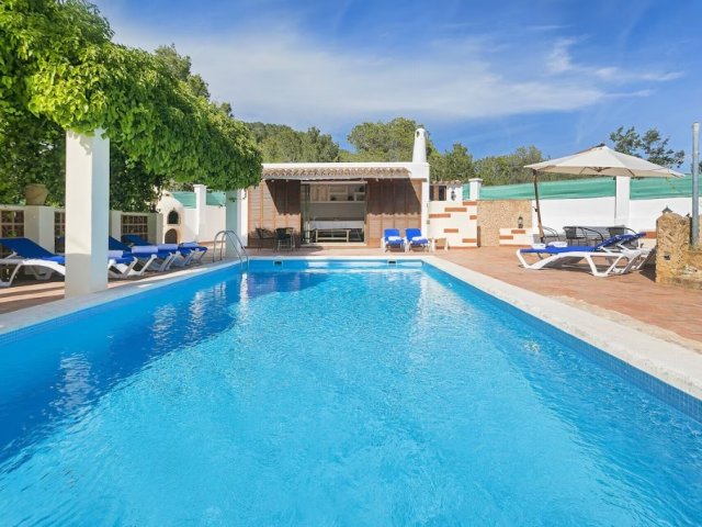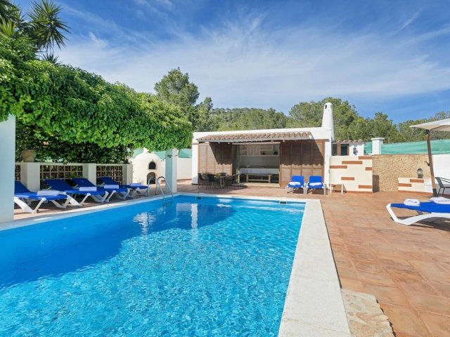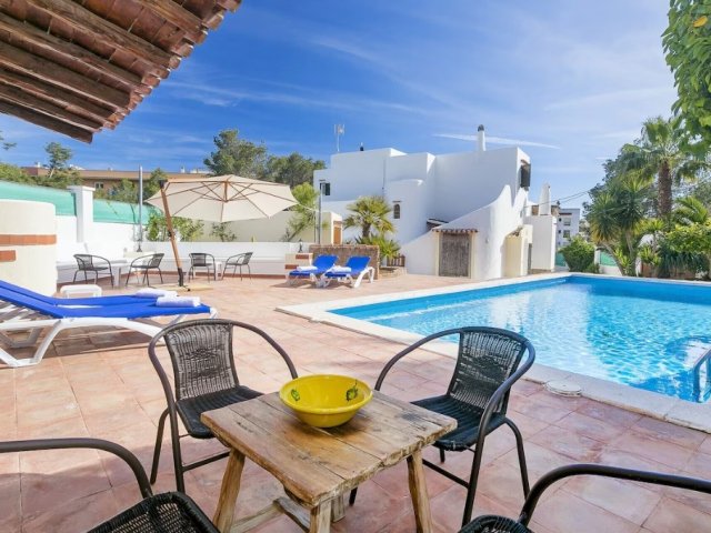 5-bed villa in central San Antonio with private pool, BBQ, AC, two kitchens, and a 5-10 min walk to Café del Mar, Sunset Strip, beaches, shops, and restaurants.