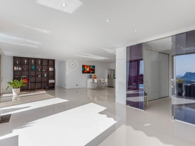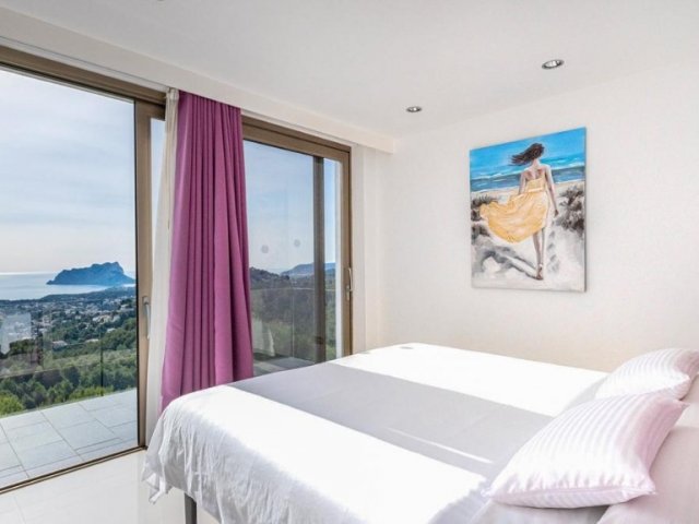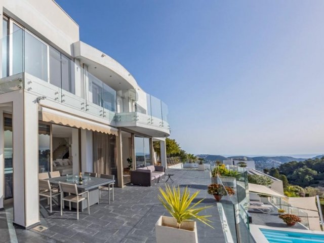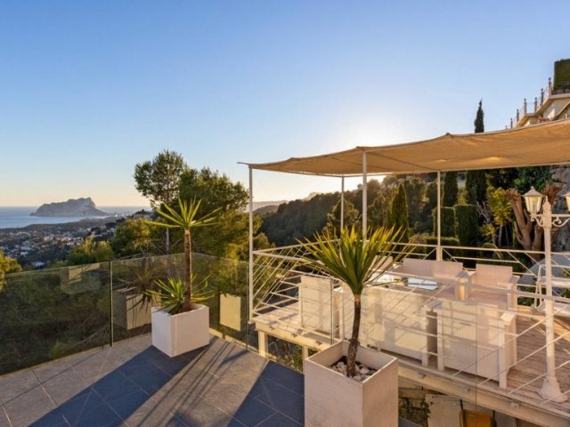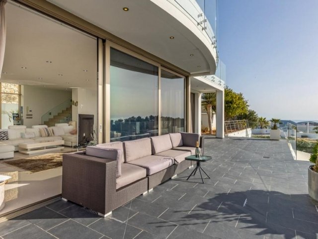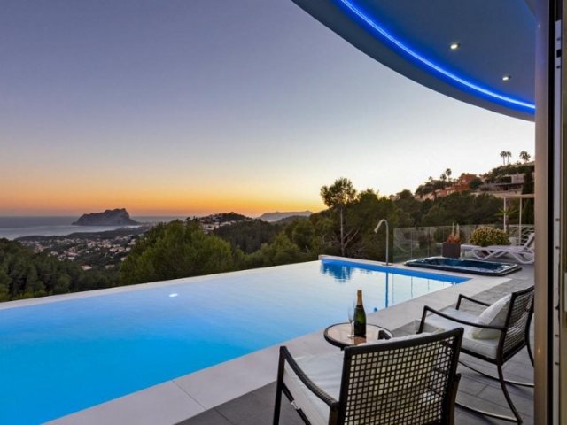This luxury 6-bedroom holiday villa in Moraira offers stunning panoramic views, a heated infinity pool, and ample space for relaxation.