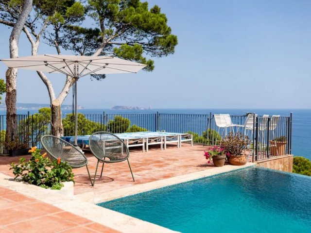 Seafront 6-bed villa in Cala Canyelles, Lloret de Mar, with hot tub, private spa, pool terrace, ocean views and spacious suites - ideal for up to 12 guests.