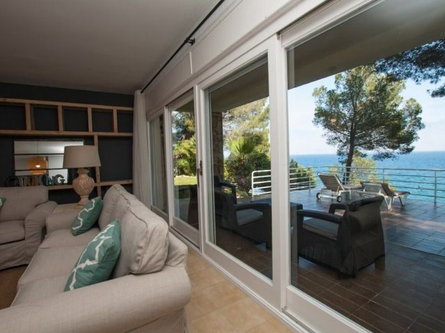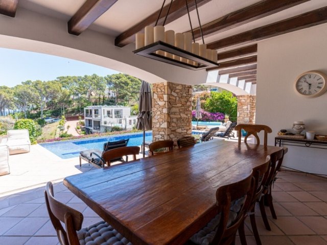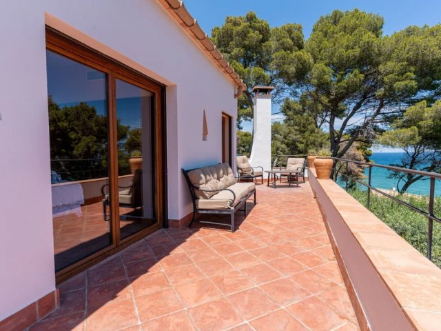 Spacious 8-bedroom beachfront villa in Blanes with infinity pool, sea views, outdoor dining, private beach access, and membership to Cala Sant Francesc Club.