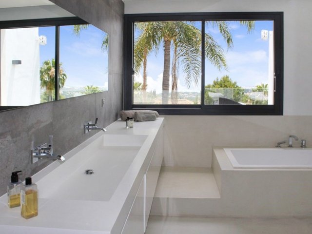 This 5-bedroom holiday villa in Nueva Andalucia offers 5 bathrooms, a private pool, a games room, and stunning panoramic views near golf courses.