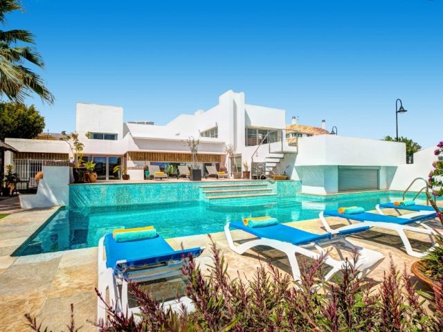 Just 350 m from sandy beaches, this luxury 4-bedroom retreat in Cala de Mijas features a private pool and Jacuzzi, ideal for memorable holiday rentals.