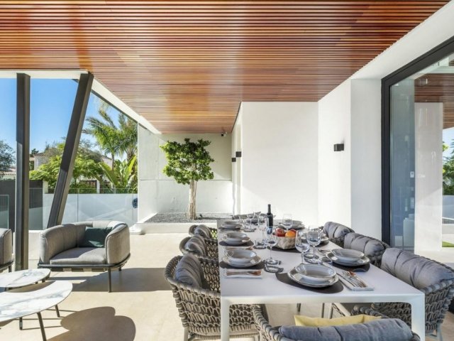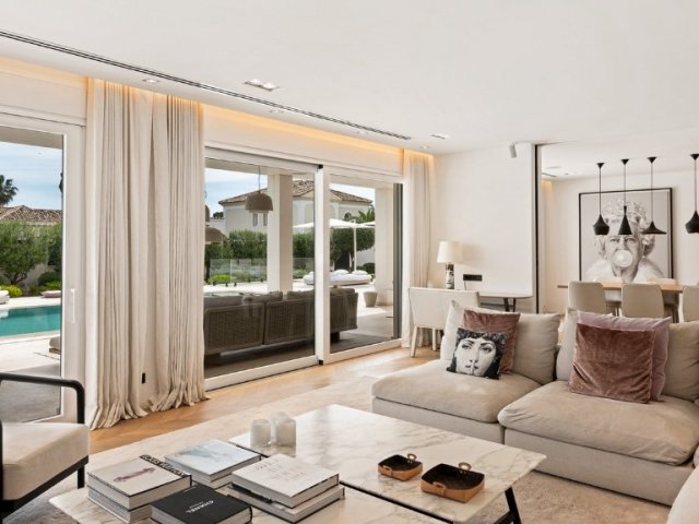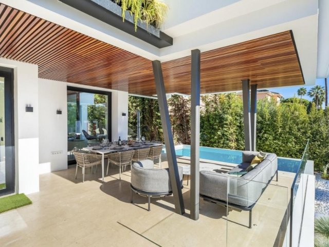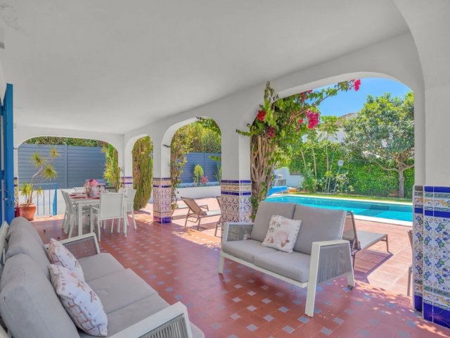 Elegant 5-bedroom Marbella villa steps from Casablanca Beach with private pool, lush garden, and modern interiors - perfect for families and beach lovers.