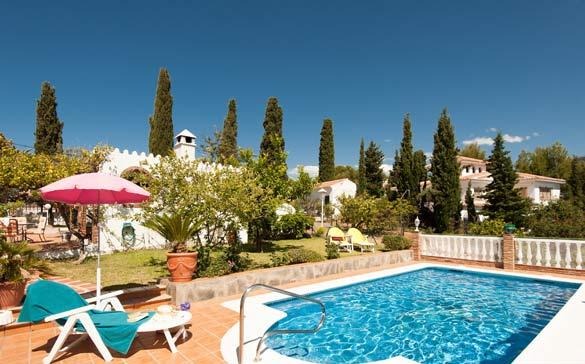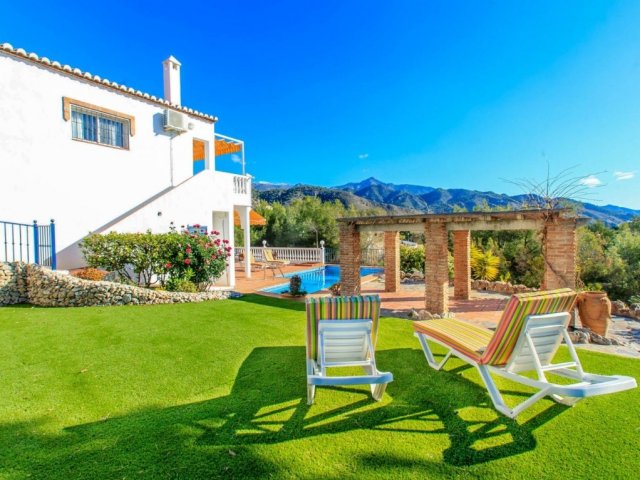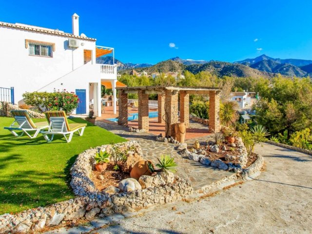 This 5-bedroom holiday villa in Frigiliana offers 3 bathrooms, sleeps 10, and features a private pool, jacuzzi, and beautiful gardens for family or groups.