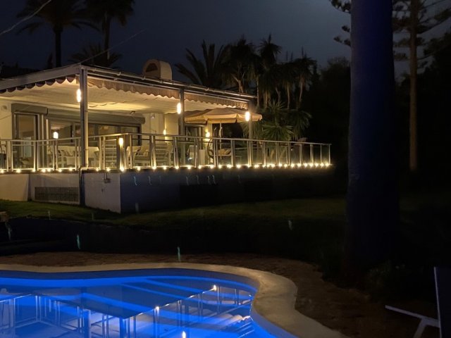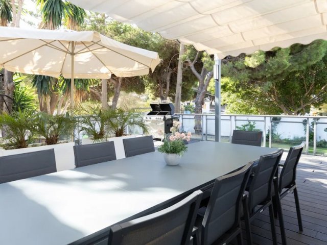 Elegant 5-bedroom villa just 50m from Cabopino Beach, near Calahonda, featuring a private pool, lush garden, and panoramic sea views near golf and marina.