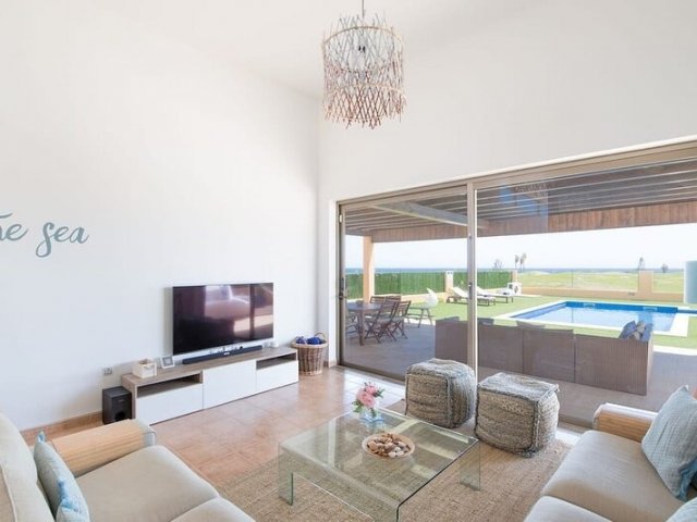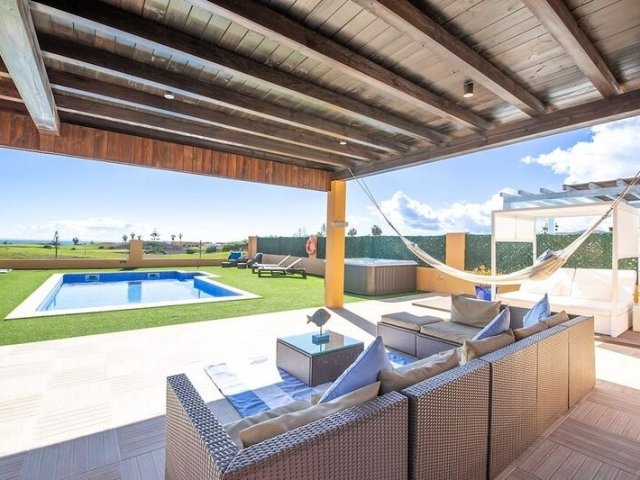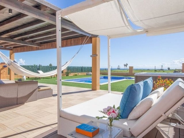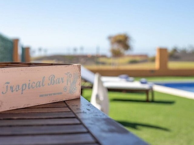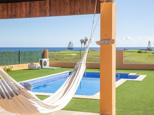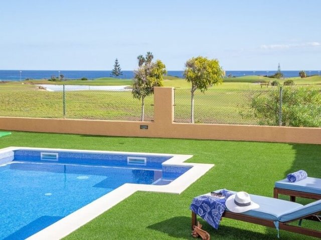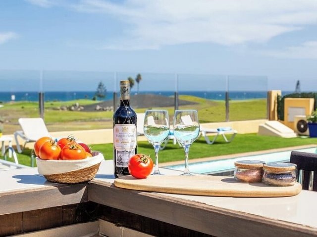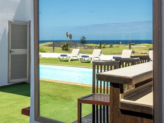This luxury holiday villa in Caleta de Fuste offers 4 bedrooms, golf course views, a private heated pool and stunning coastal scenery, sleeping up to 8 guests.