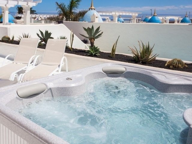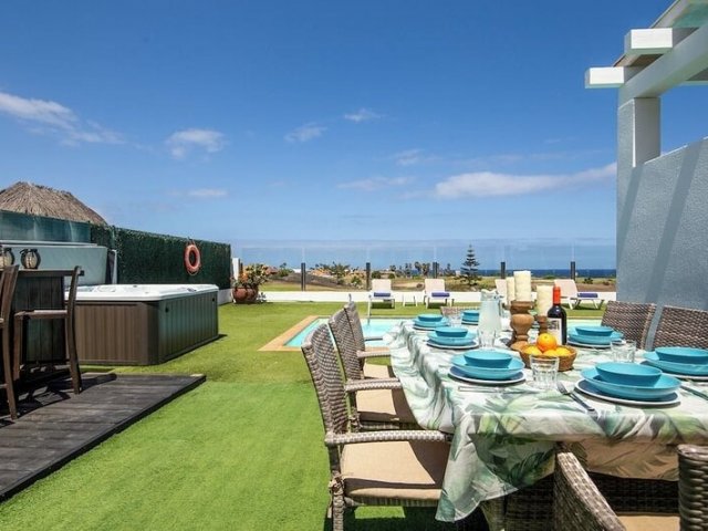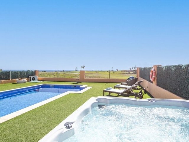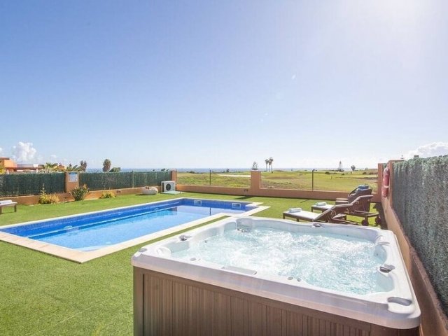 This holiday villa in Caleta de Fuste, Fuerteventura, offers 4 bedrooms, a heated pool, a jetted spa, and stunning ocean views, ideal for a family getaway.