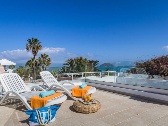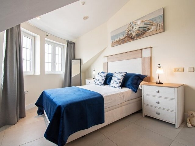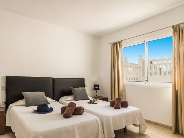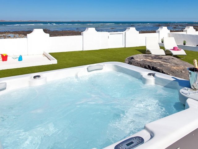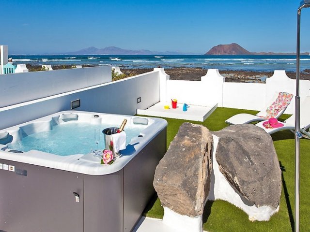 This holiday home in Corralejo offers ocean views, 3 bedrooms, a private terrace, jacuzzi and access to a shared pool, comfortably sleeping up to 6 guests.