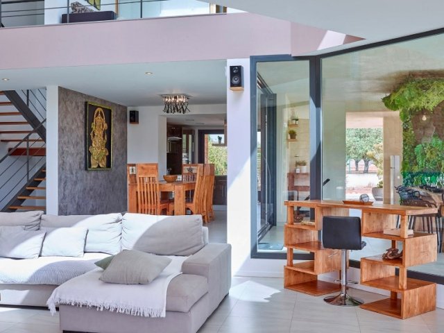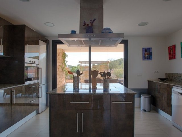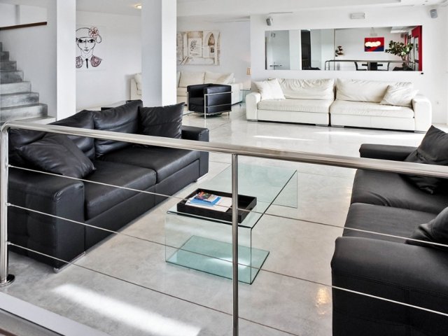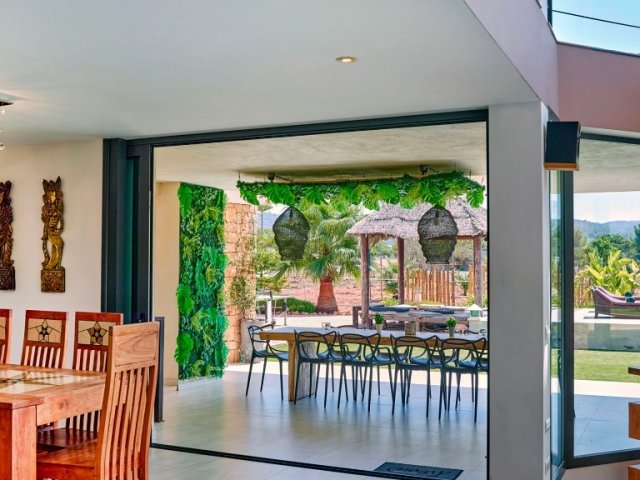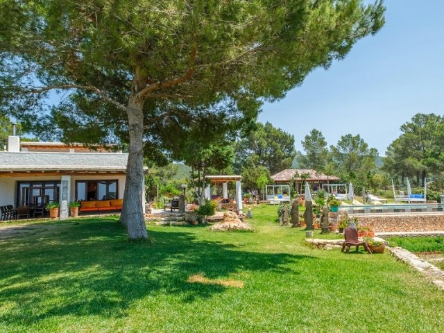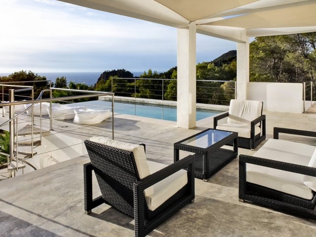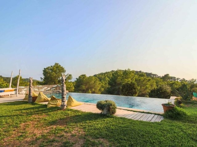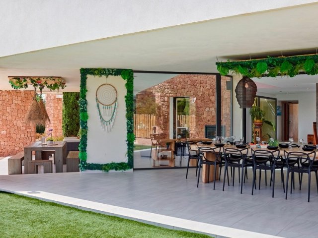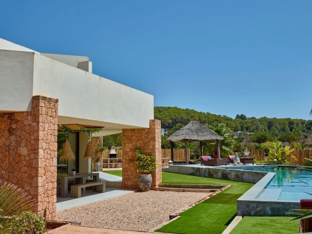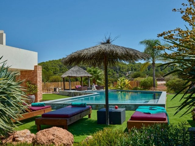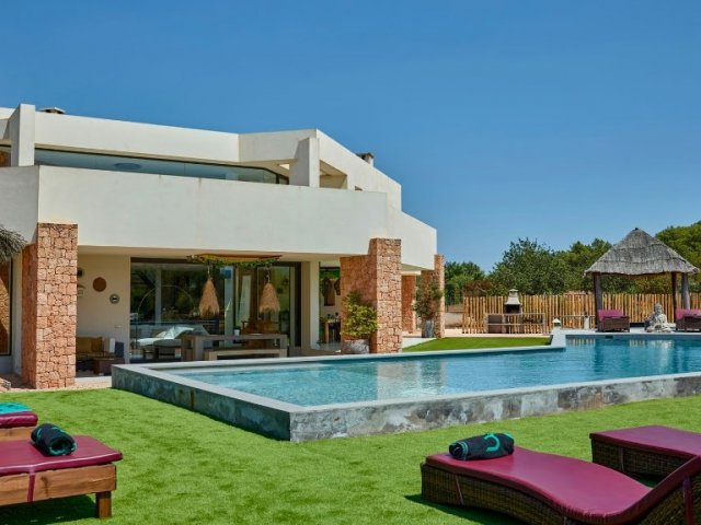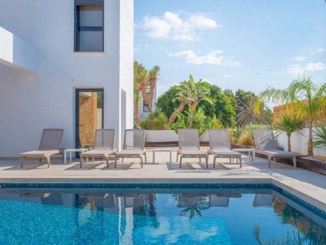 Modern 5-bedroom holiday villa in Sant Antoni de Portmany, Ibiza, with private saltwater pool, spacious terraces, barbecue, ping-pong, and 18,000 m² garden.