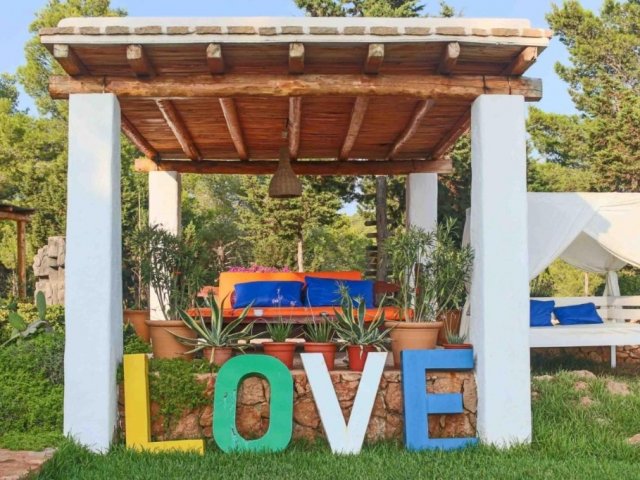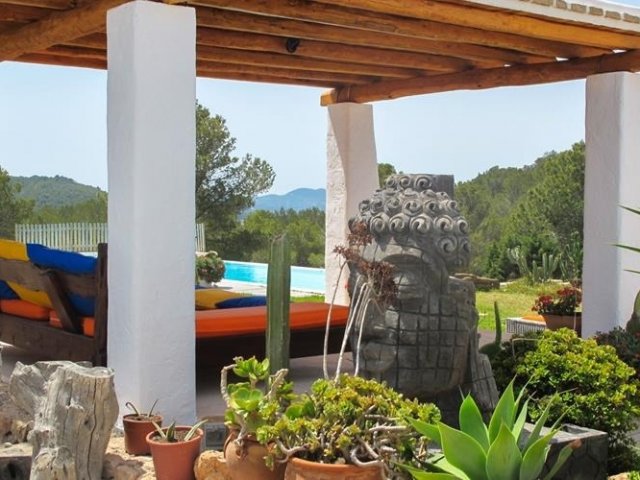 Charming 3-bedroom holiday villa in Cala Salada, Sant Antoni de Portmany, Ibiza, with private pool, sunset terraces, garden, barbecue, and outdoor lounge.
