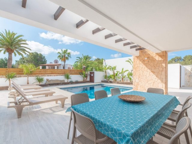 Modern 4-bed villa 250m from the sea with pool, garden, BBQ, terrace, AC, and bright interiors-perfect for 8 guests in quiet San Antonio Bay.
