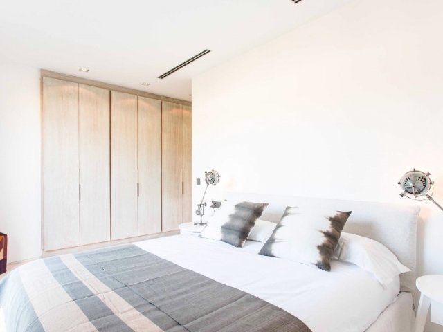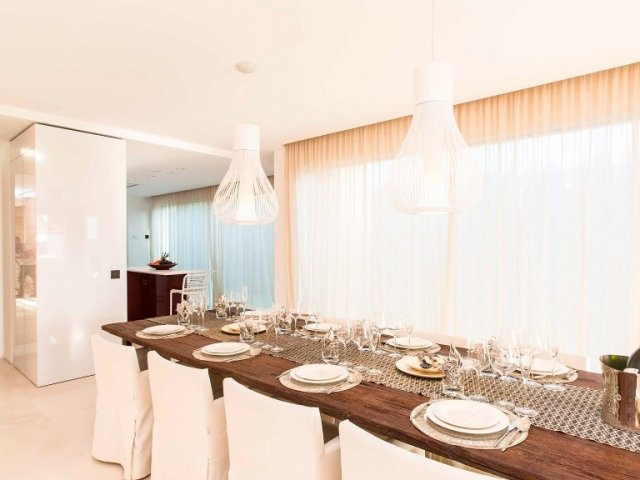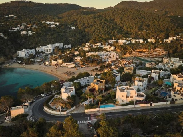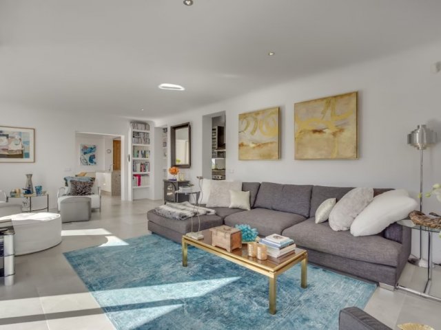 A luxurious 5-bedroom retreat in Cala Tarida, offering private beach access, stunning sea views, open-plan living, and elegant furnishings.
