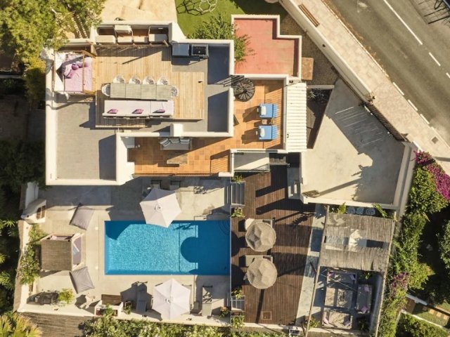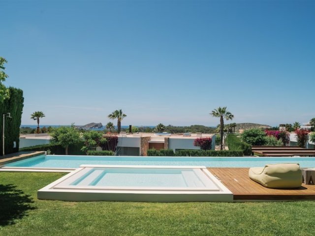 Luxurious 5-bedroom holiday villa in Sa Carroca, Ibiza, featuring a 17m beach-style pool, panoramic sea views, lush gardens, and expansive terraces.