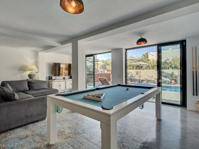 Luxury 5-bed Ibiza villa with heated pool, sea and sunset views, games room, terraces, and a 5-minute walk from family-friendly Cala Vadella Beach.
