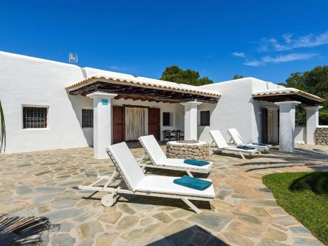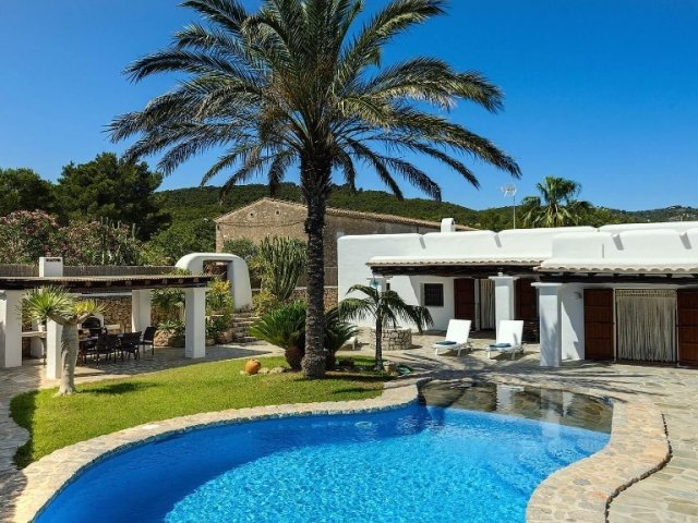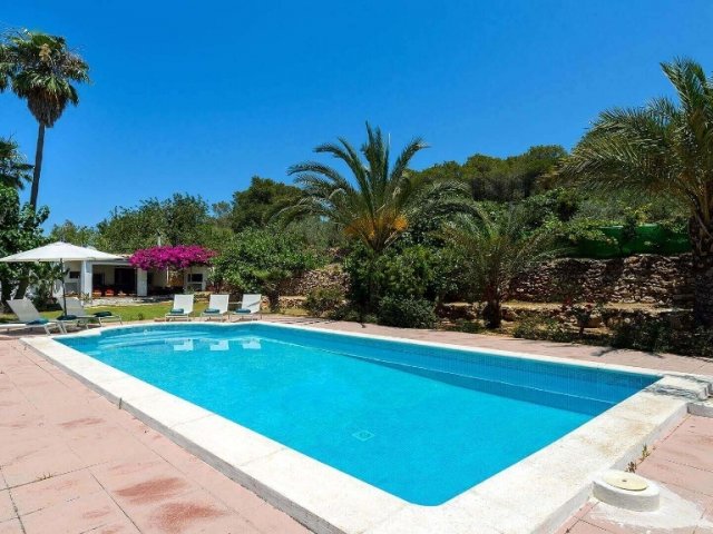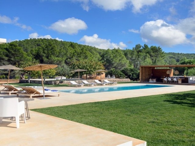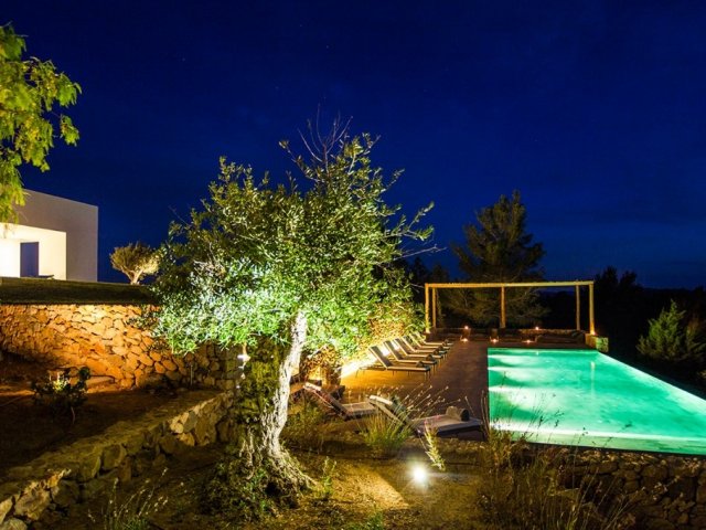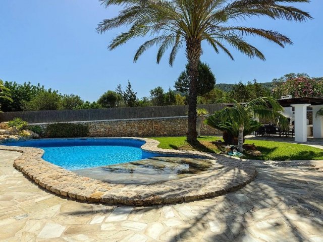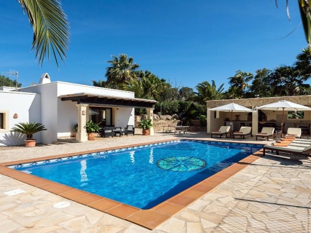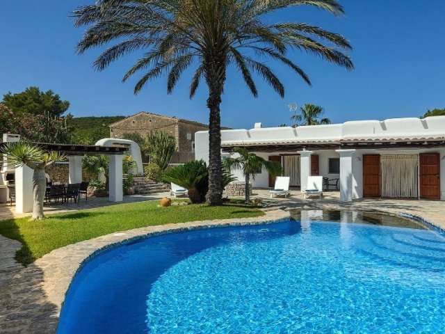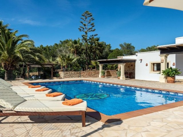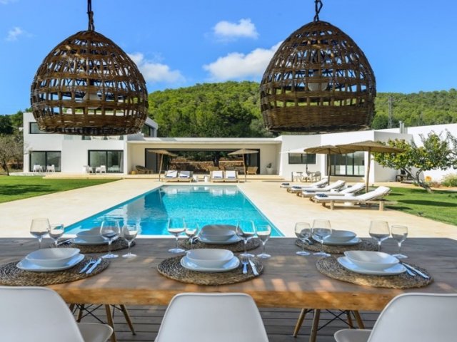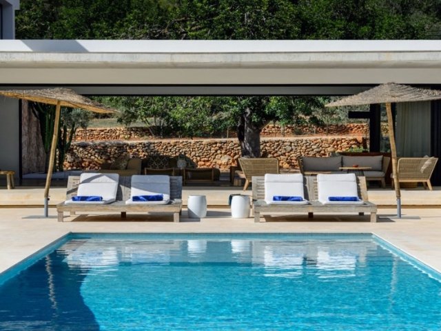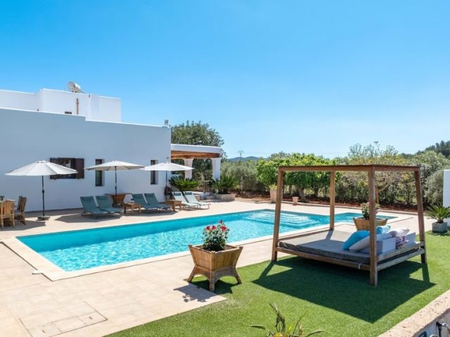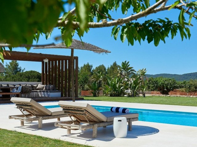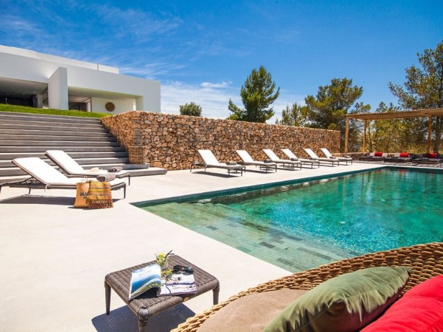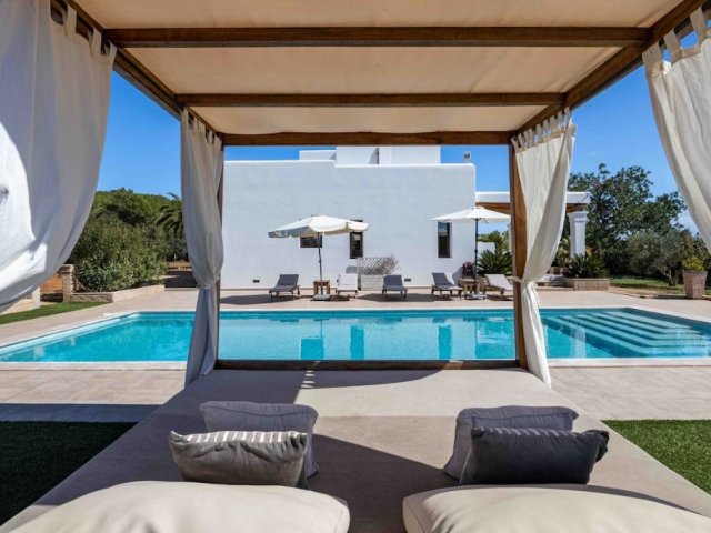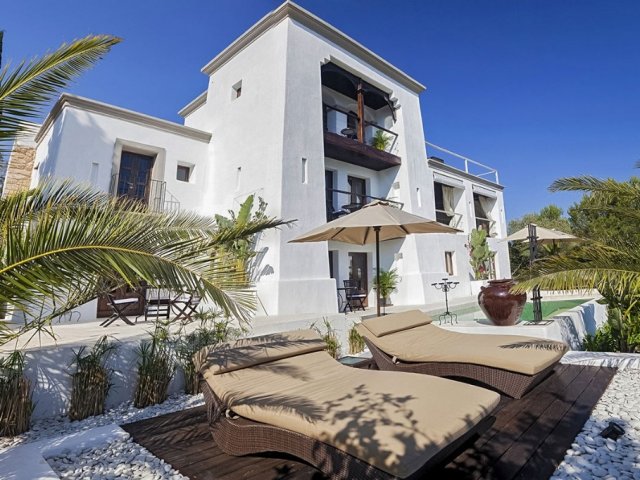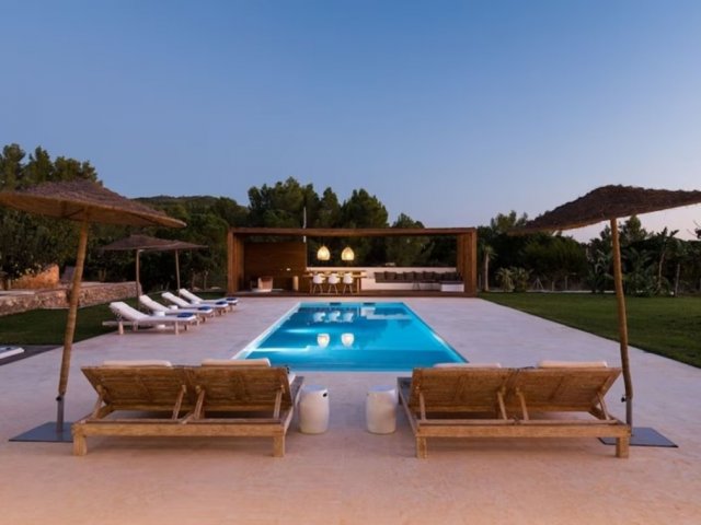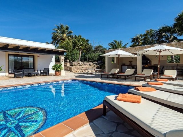 Luxury villa in Ibiza, 8 bedrooms, private pool, and beautiful gardens for a relaxing family holiday. Sleeps 16 guests. Ideal for a serene and luxurious getaway