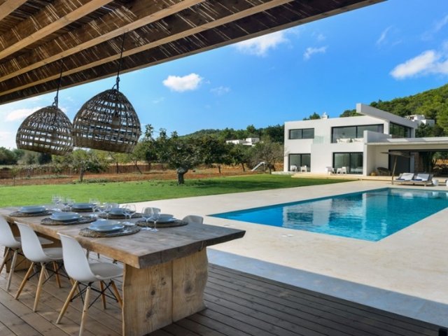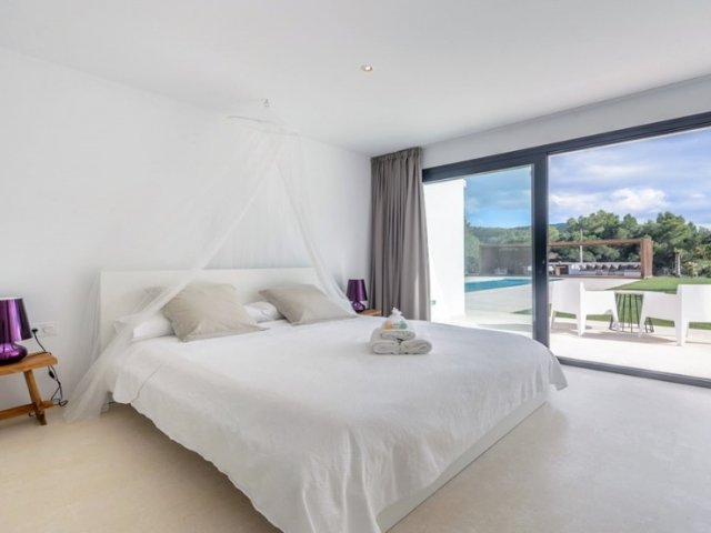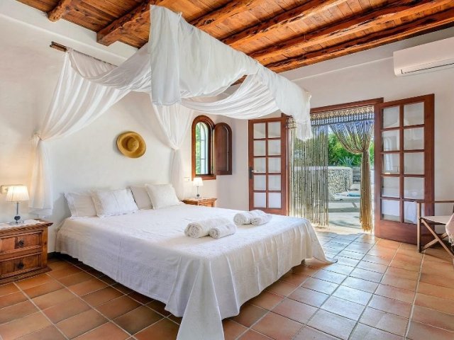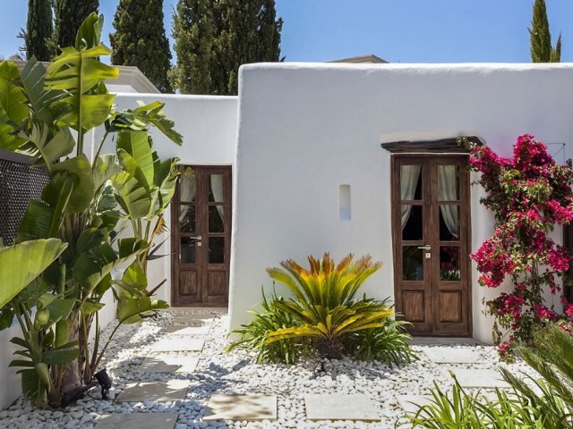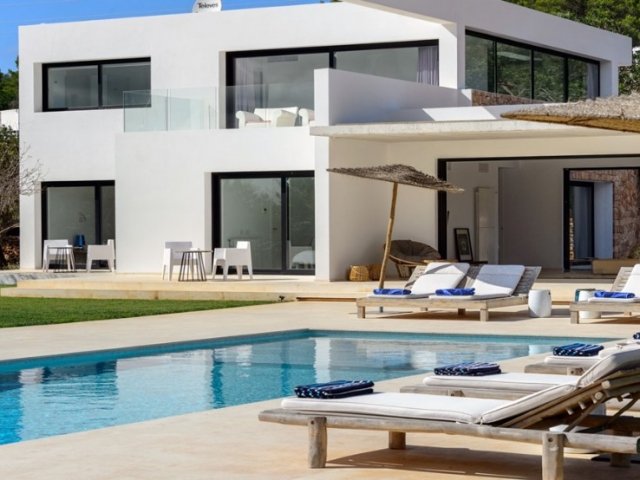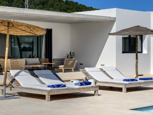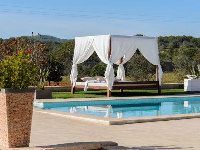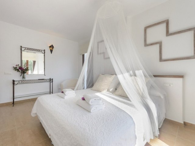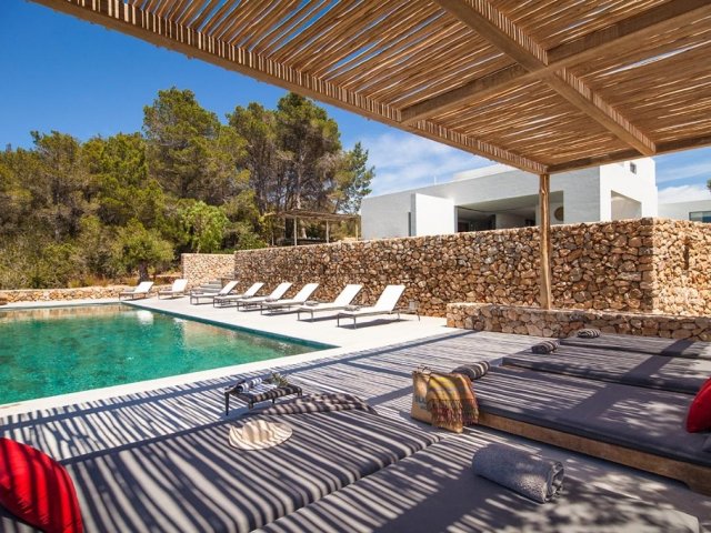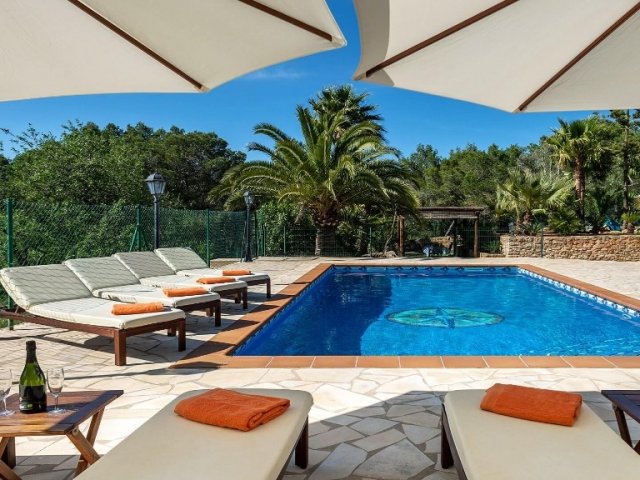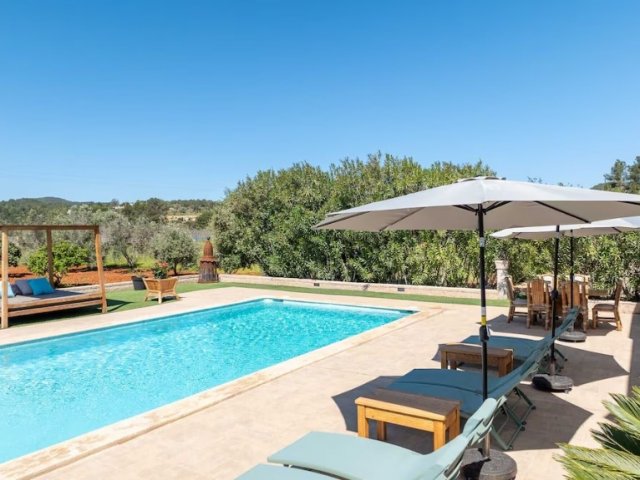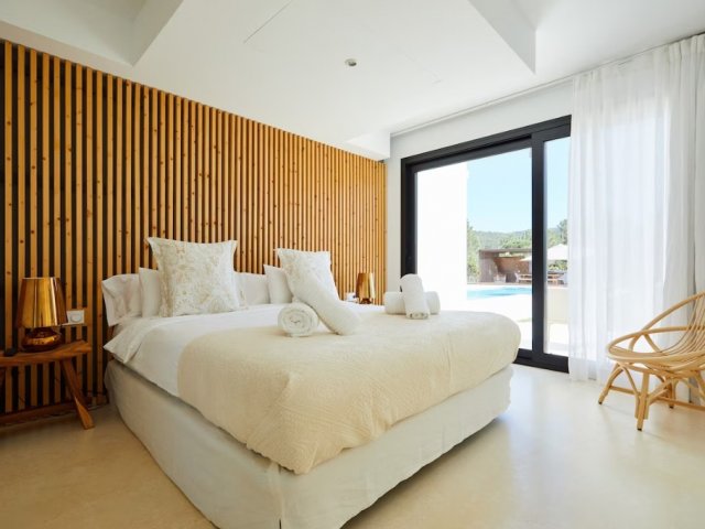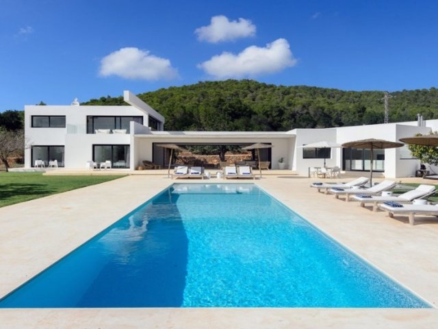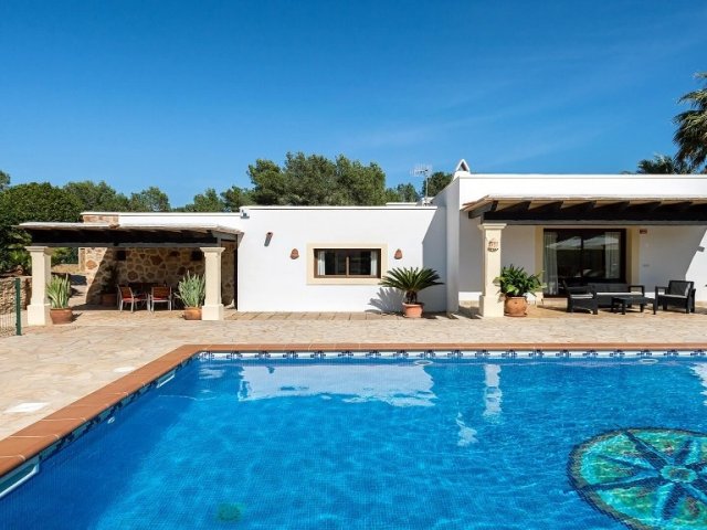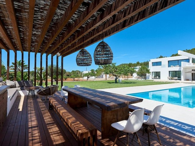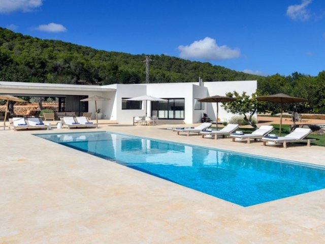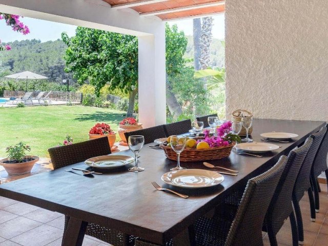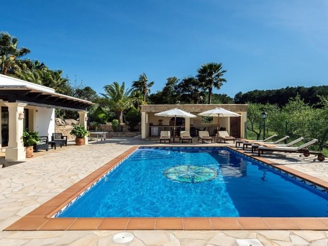 Luxury villa in Ibiza, 8 bedrooms, private pool, and beautiful gardens for a relaxing family holiday. Sleeps 16 guests. Ideal for a serene and luxurious getaway