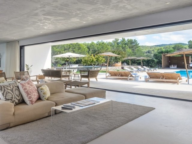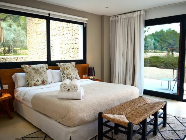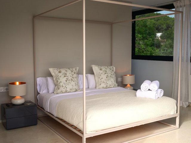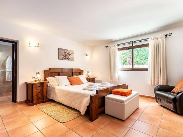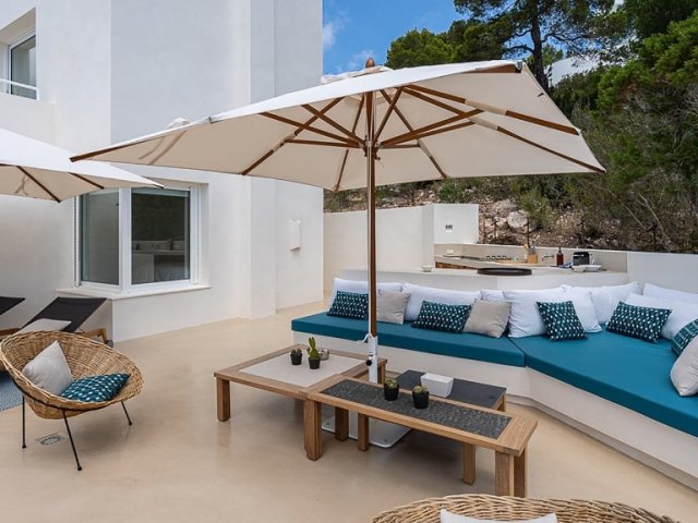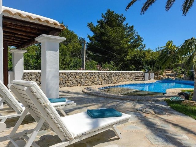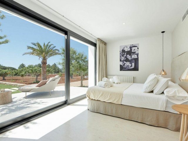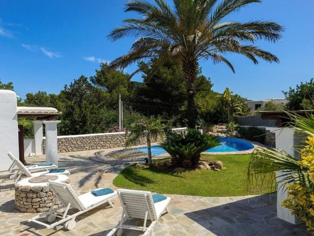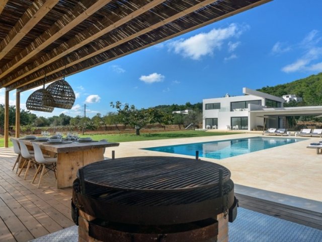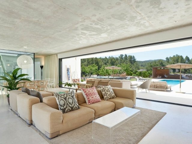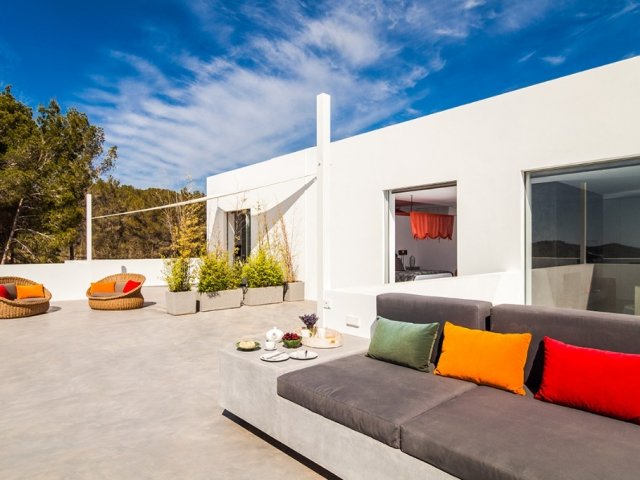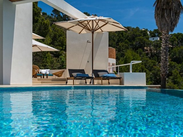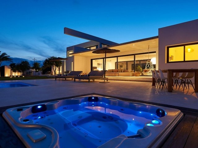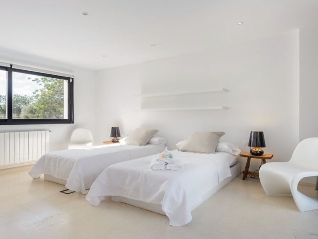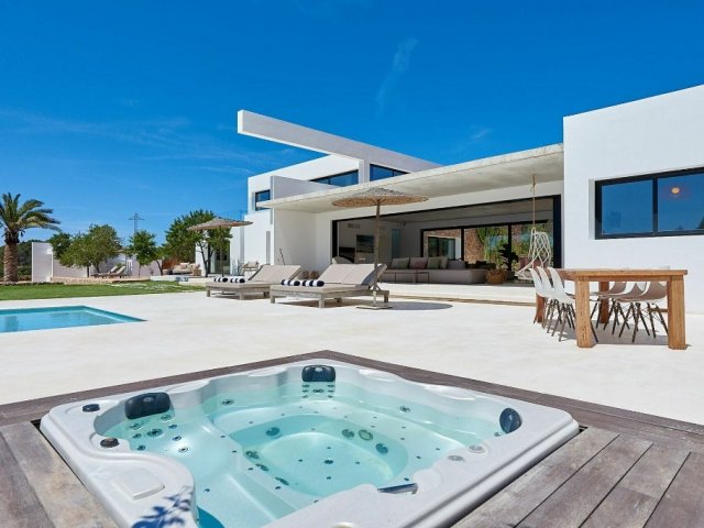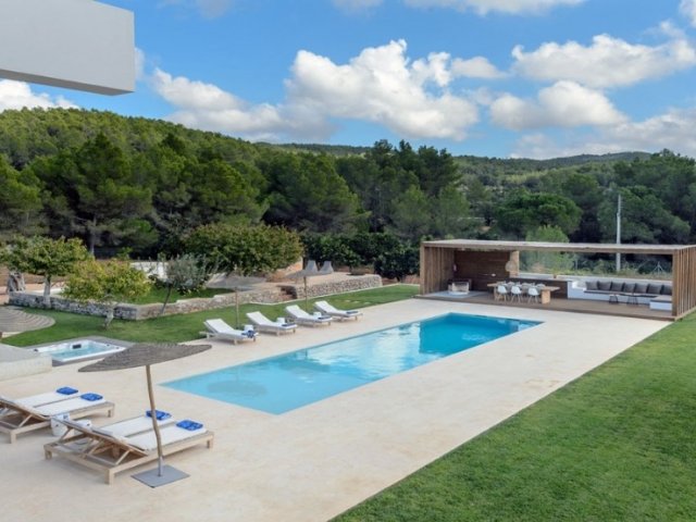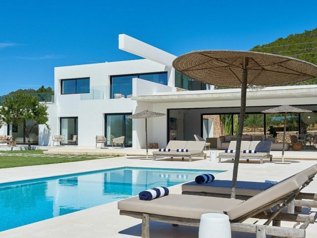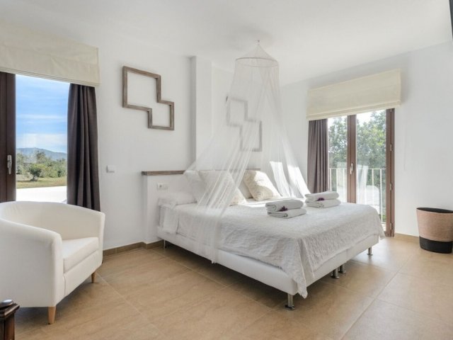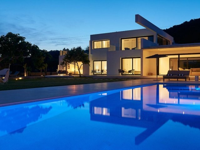 Luxury villa in Ibiza, 8 bedrooms, private pool, and beautiful gardens for a relaxing family holiday. Sleeps 16 guests. Ideal for a serene and luxurious getaway