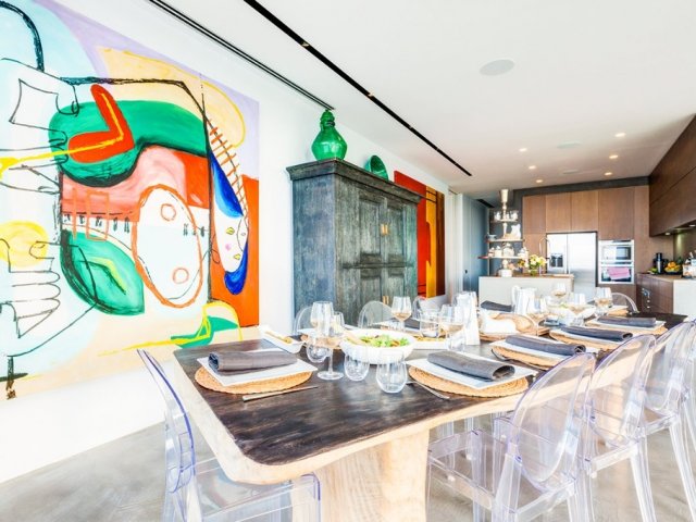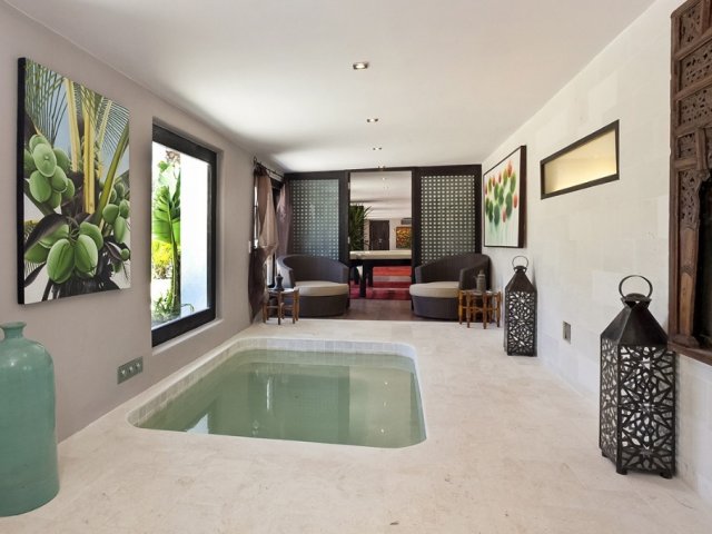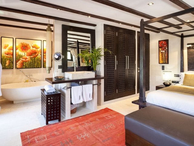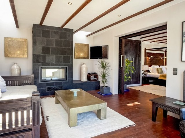 A unique 8-bedroom retreat in Sant Miquel, blending Asian and Mediterranean styles, with lush gardens and heated swimming pools.