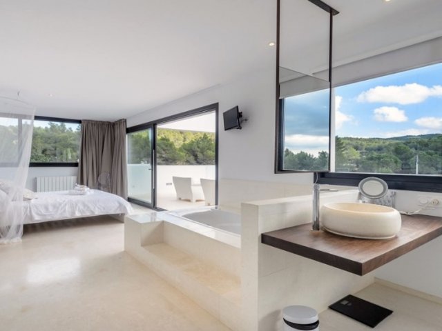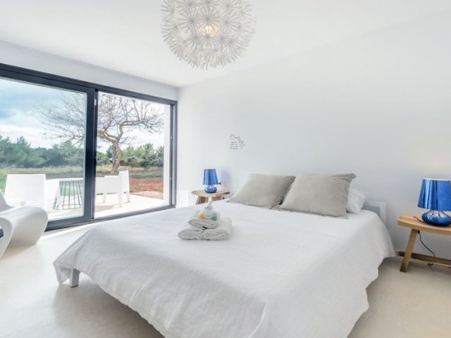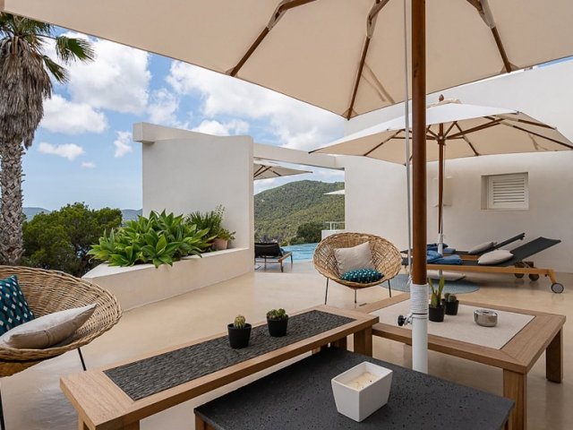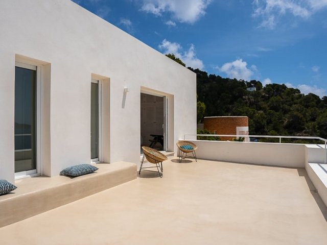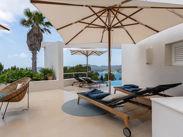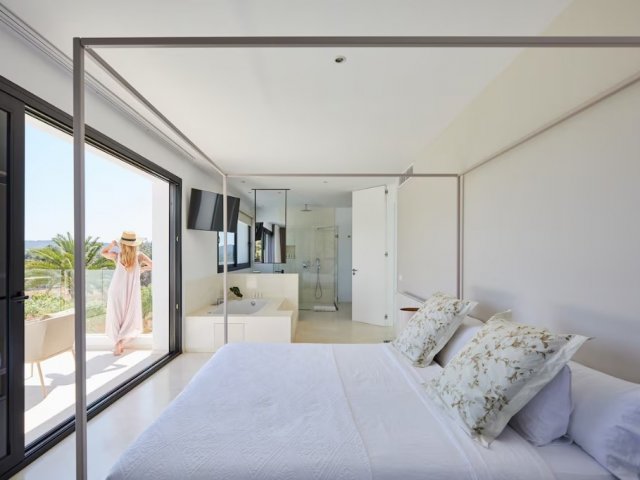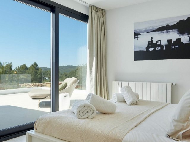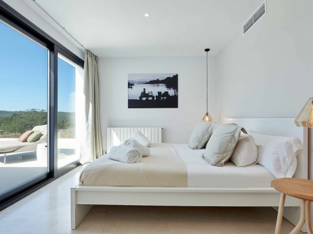 Modern 3-bedroom holiday villa in Cala San Vicente, Ibiza with private pool, large terraces, stunning panoramic views, and a master suite with private terrace.