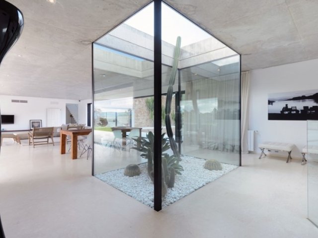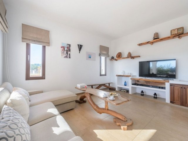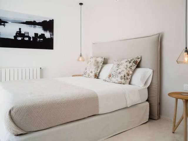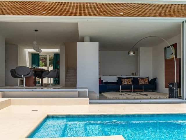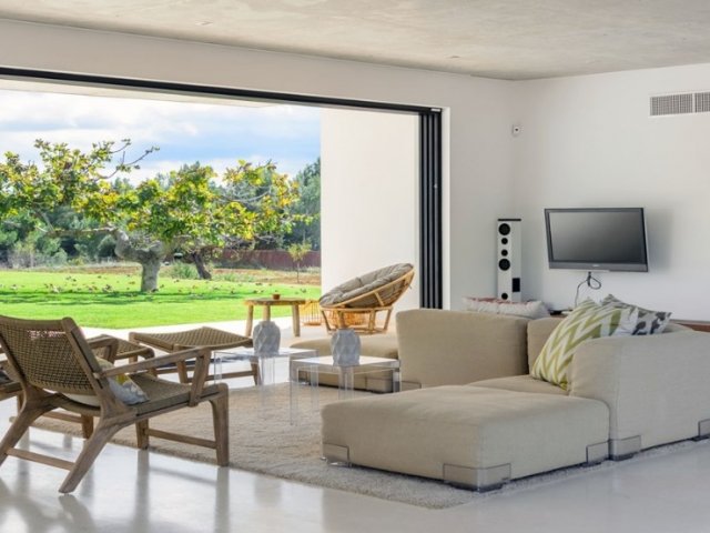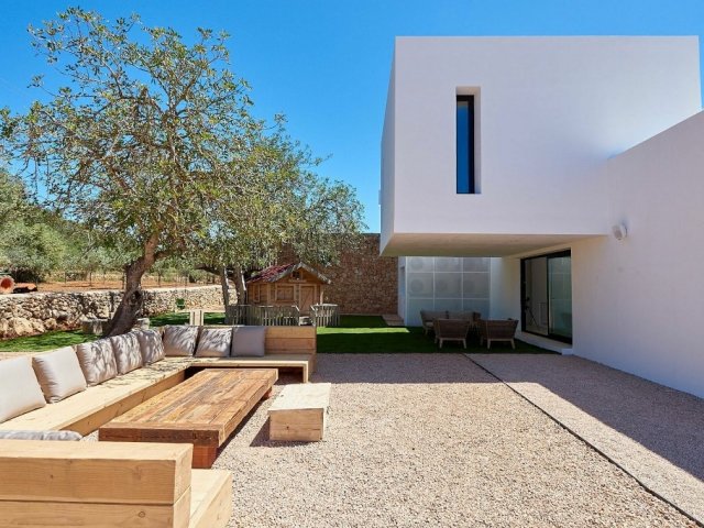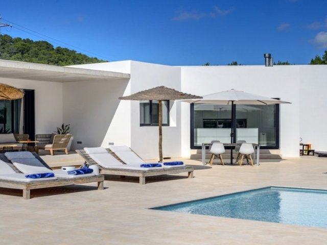 Bright 4-bed minimalist villa with pool, chill-out zones, gardens, and stylish interiors, steps from La Paloma Restaurant in peaceful Sant Joan.