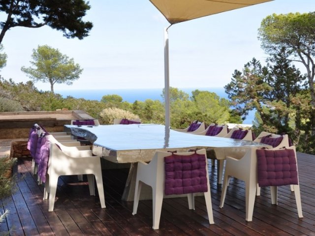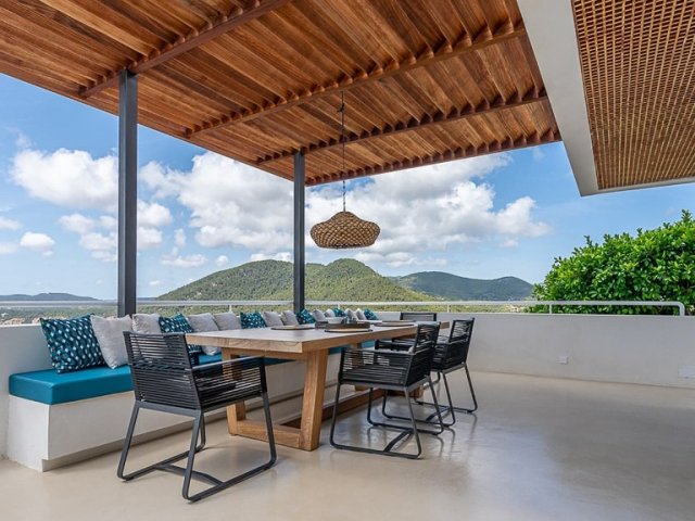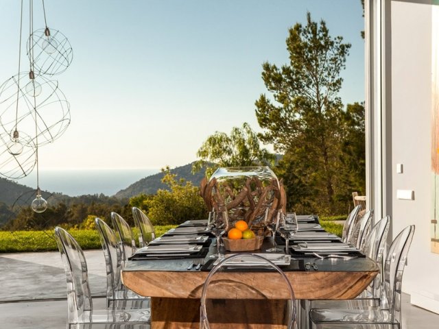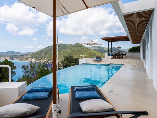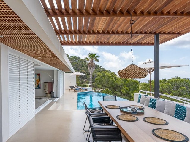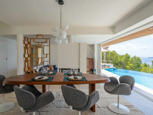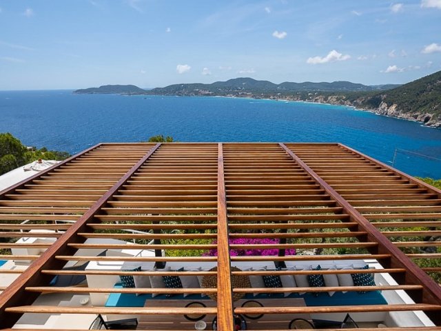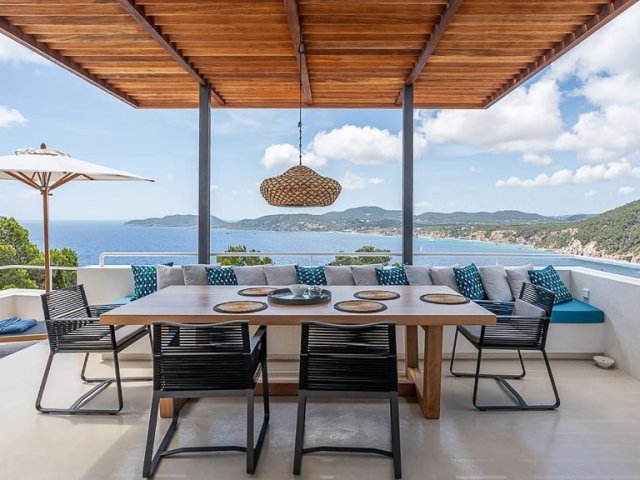 This luxury holiday villa in Sant Joan offers panoramic sea views, a secluded setting and modern amenities, ideal for groups of up to 12 guests.
