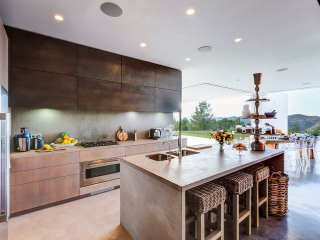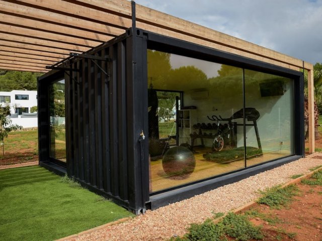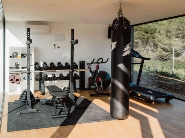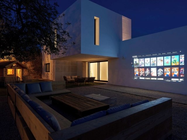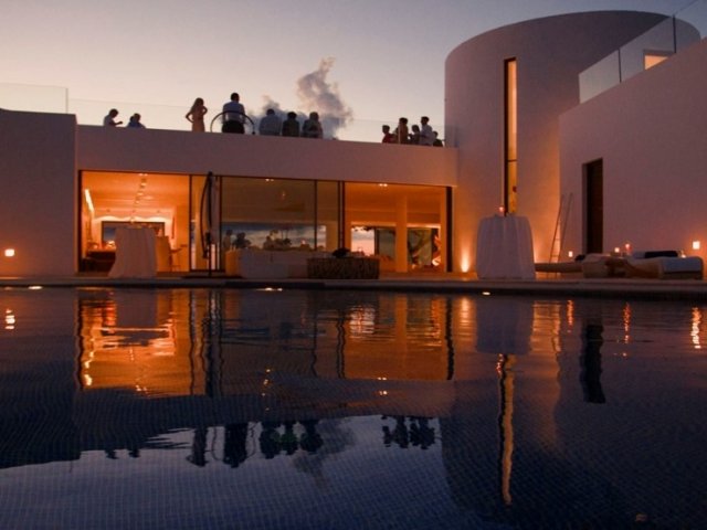 This modern holiday villa in northern Ibiza offers 8 bedrooms for up to 16 guests, with a private pool, gym, outdoor cinema and luxury amenities.
