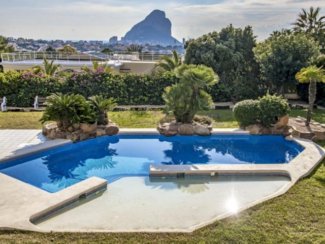 This luxury holiday villa in Calpe offers 6 bedrooms, 3 bathrooms, panoramic sea views, a lagoon-shaped pool, and elegant interiors for a stylish stay.