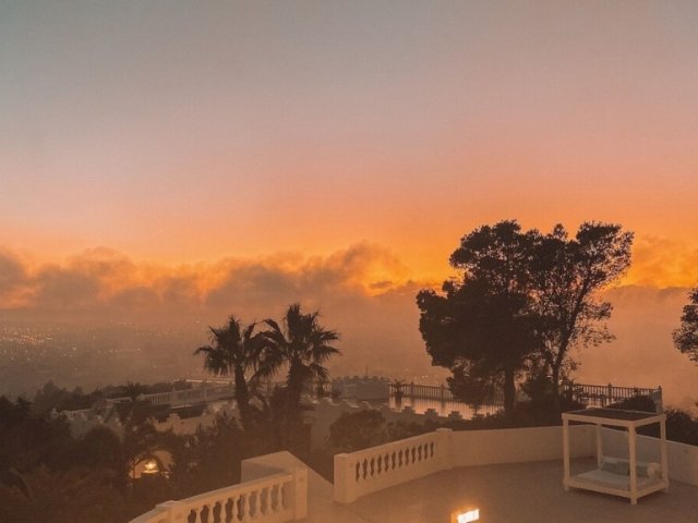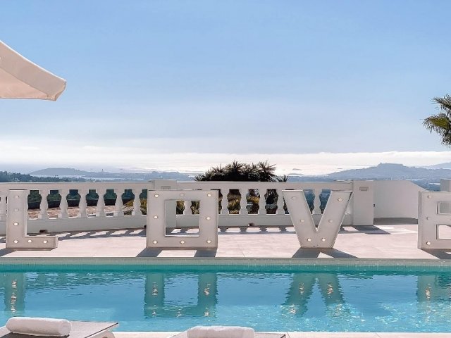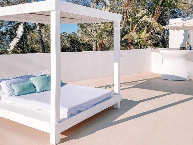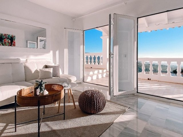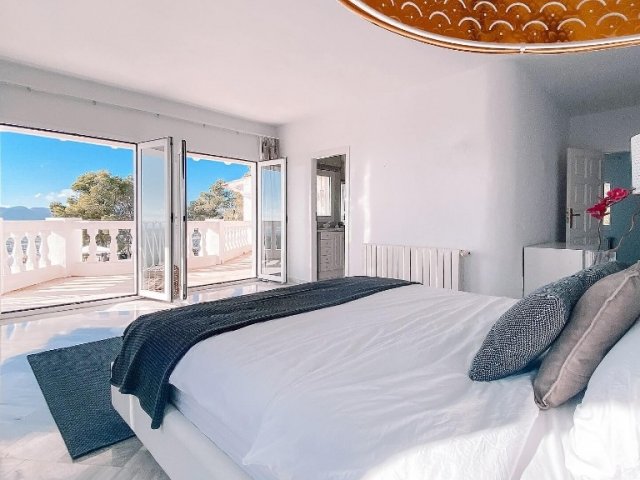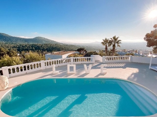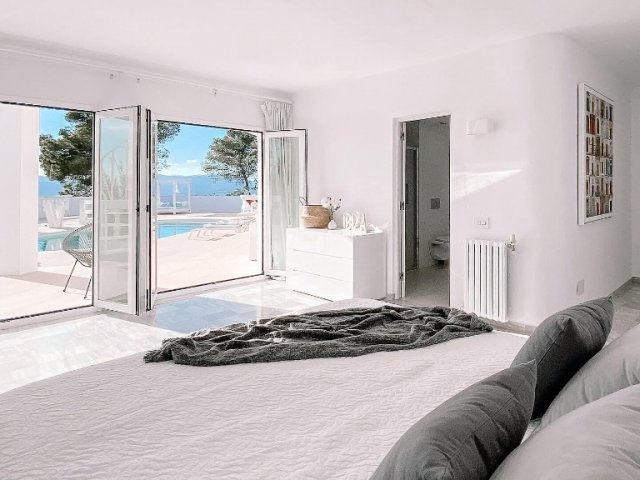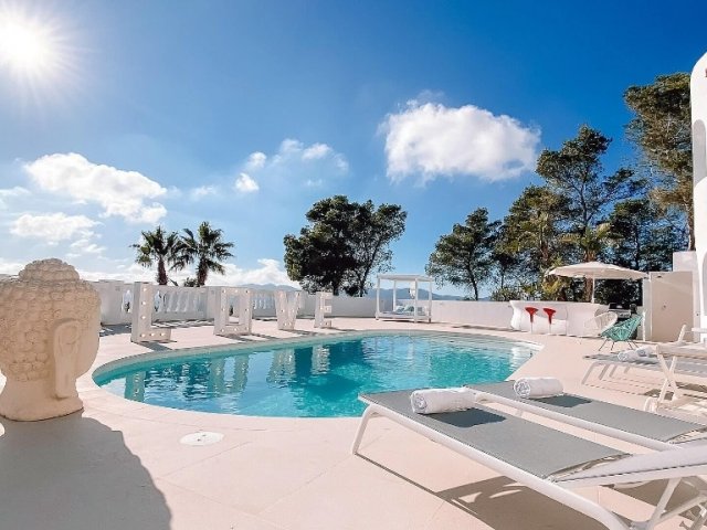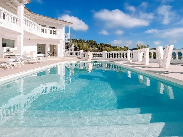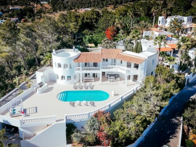 An elegant 5-bedroom retreat in Ibiza, set high above the sea with breathtaking views over Sol den Serra bay.