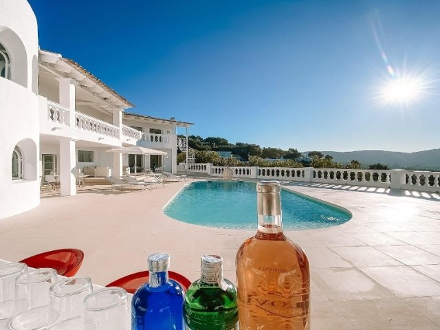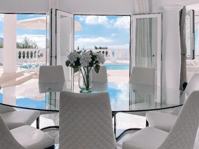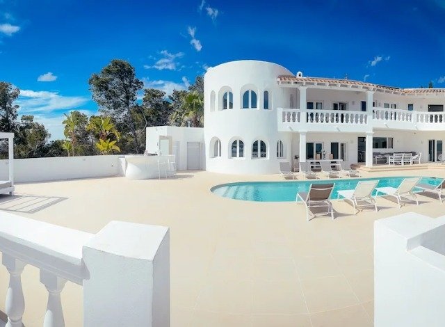 A luxury 6-bedroom holiday retreat in Can Furnet, Ibiza, offering five bathrooms, stunning sea views, a private pool, and space for up to 12 guests.