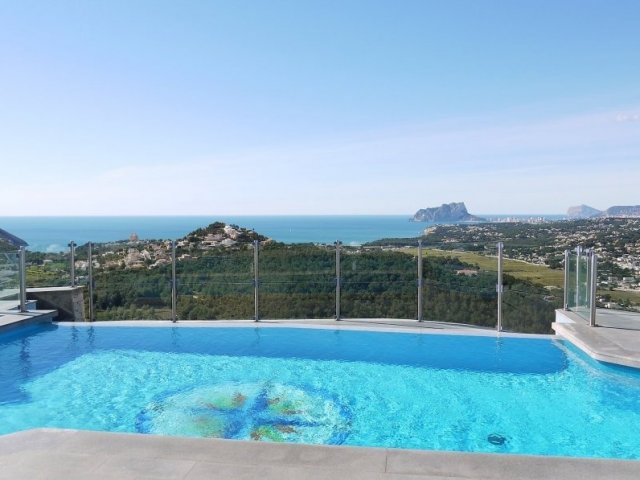 This luxury 6-bedroom holiday villa in Moraira offers stunning panoramic views, a heated infinity pool, and ample space for relaxation.