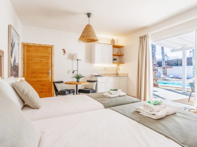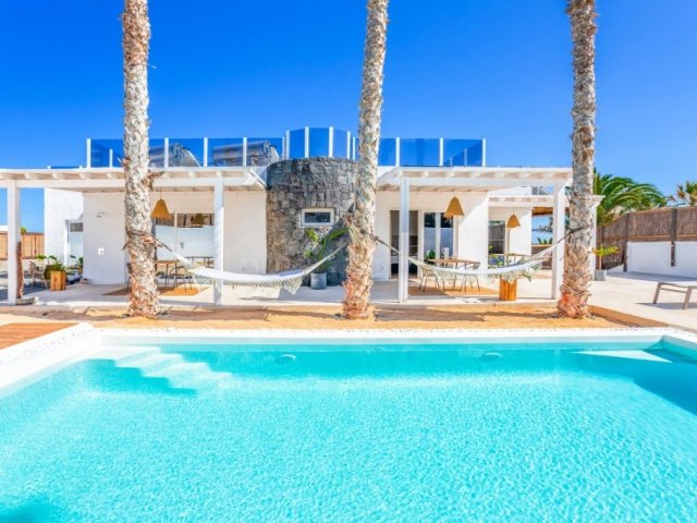 Luxurious 5-bedroom villa in Arrieta, Lanzarote with ocean views, private pool, yoga studio, and rooftop terrace. Perfect for families and groups.