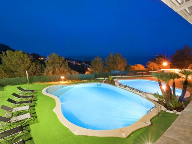 This luxury holiday villa in Mallorca offers multiple pools, sports facilities and breathtaking sea views, ideal for exclusive island rentals.
