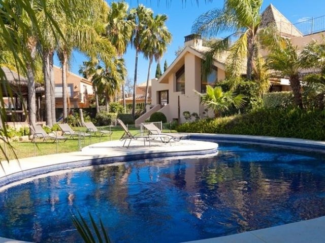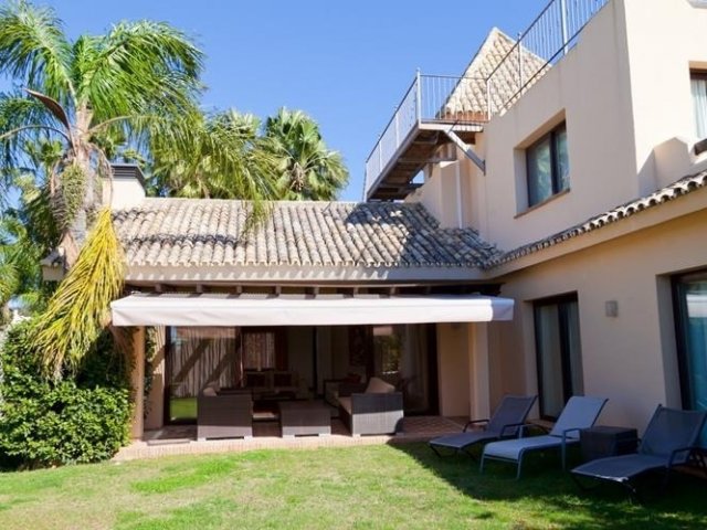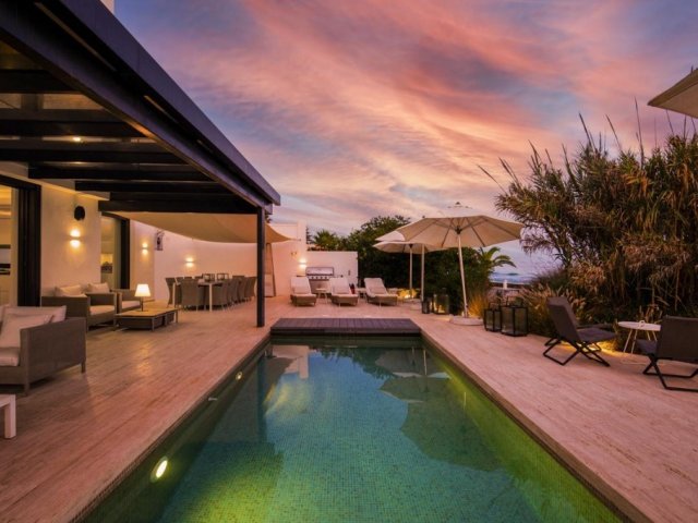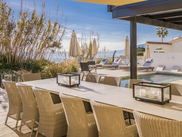 This 6-bedroom holiday villa in Marbella offers 4 bathrooms, a private pool, jacuzzi, sauna, and direct access to Costabella beach, sleeps 12.