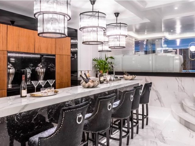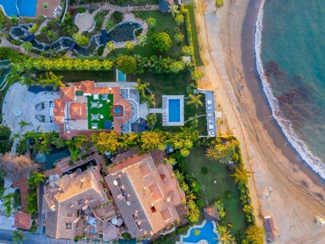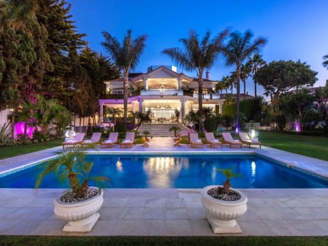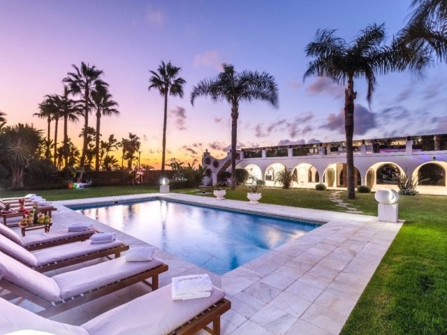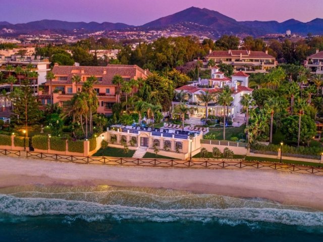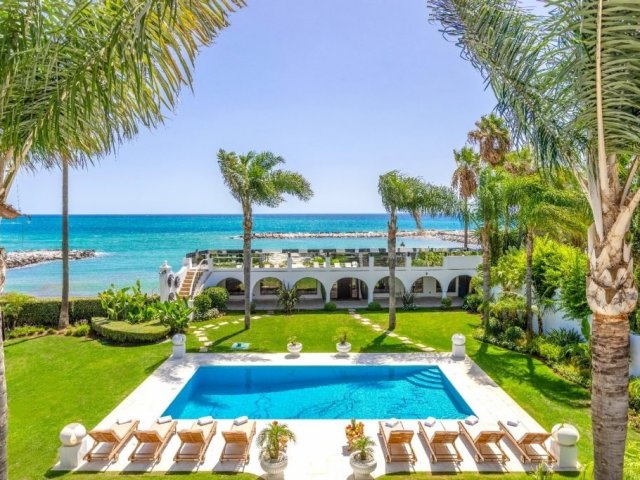 This opulent beachfront holiday villa in Puerto Banus offers 9 bedrooms, lavish amenities, direct beach access and stunning sea views.