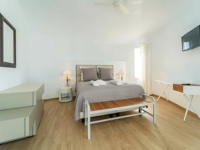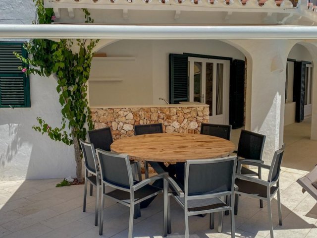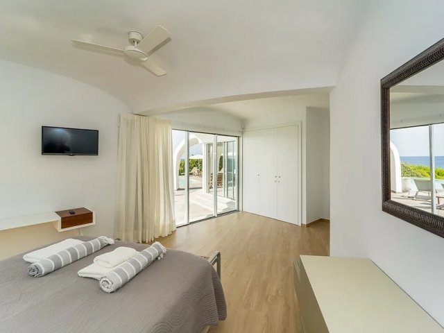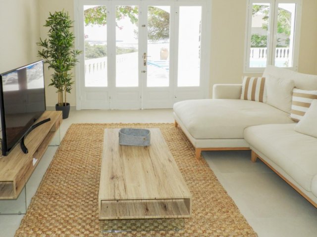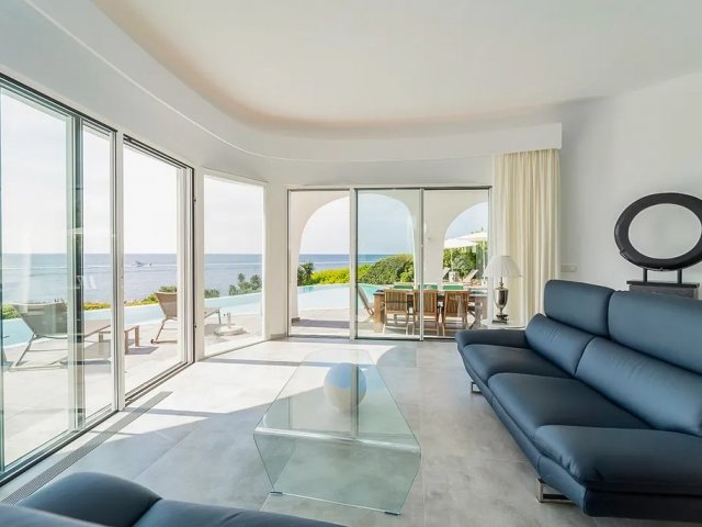 A stunning 5-bedroom luxury retreat in Calan Bosch, Menorca, featuring a private pool, spacious lounge, sea views, and easy access to nearby beaches.