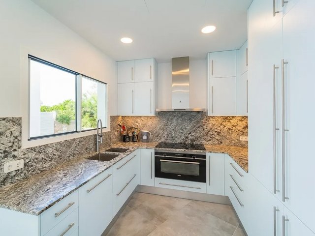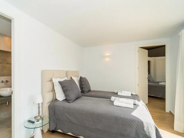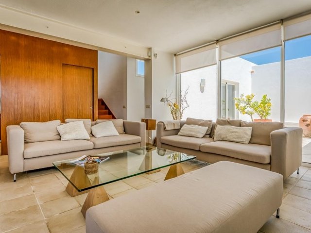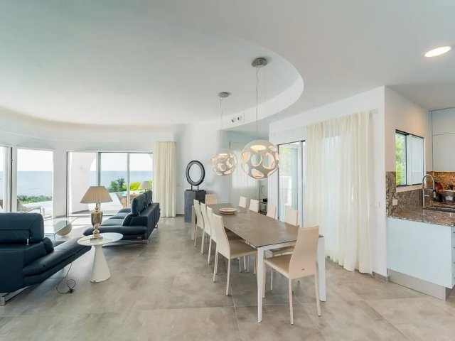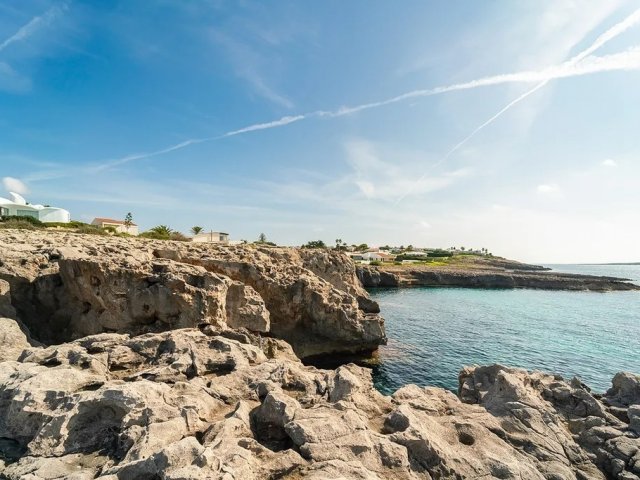 This five-bedroom waterfront hideaway in Punta Prima accommodates up to 10 guests, offering direct sea access, a private pool and generous living spaces.