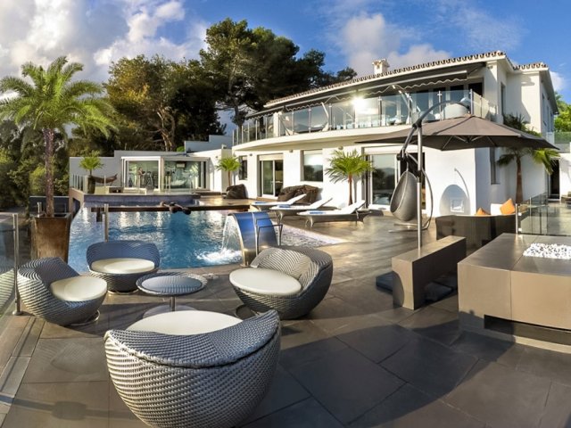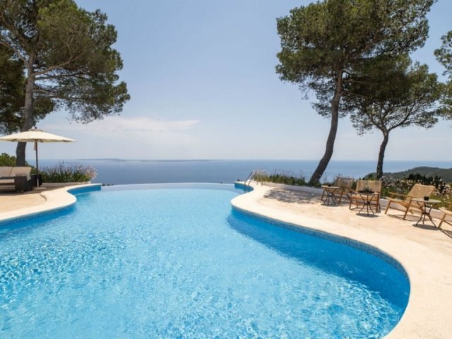 Luxurious 6-bedroom villa near Es Cubells with 300-degree views, infinity pool, and expansive grounds. Ideal for privacy and opulent relaxation.