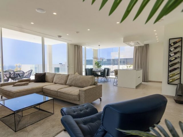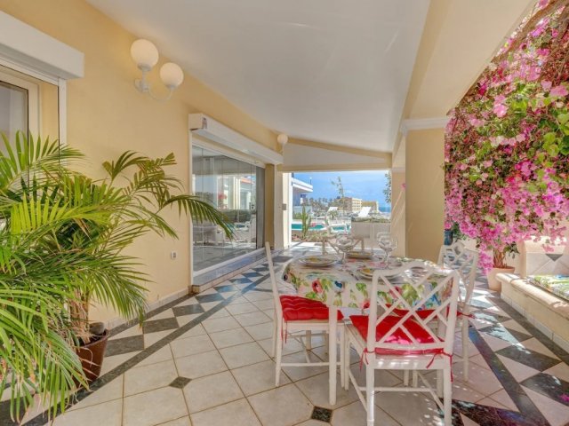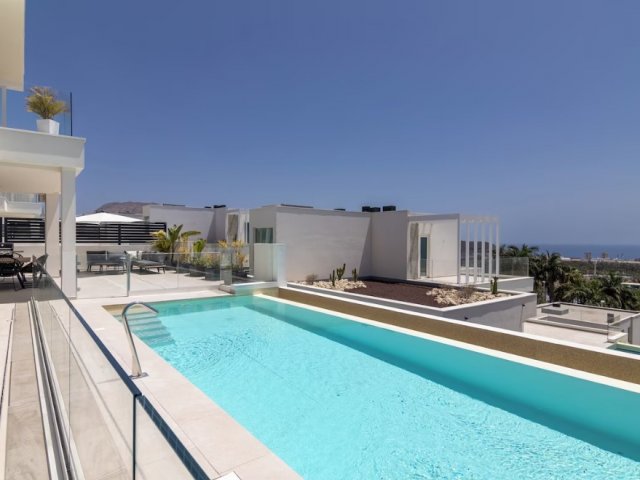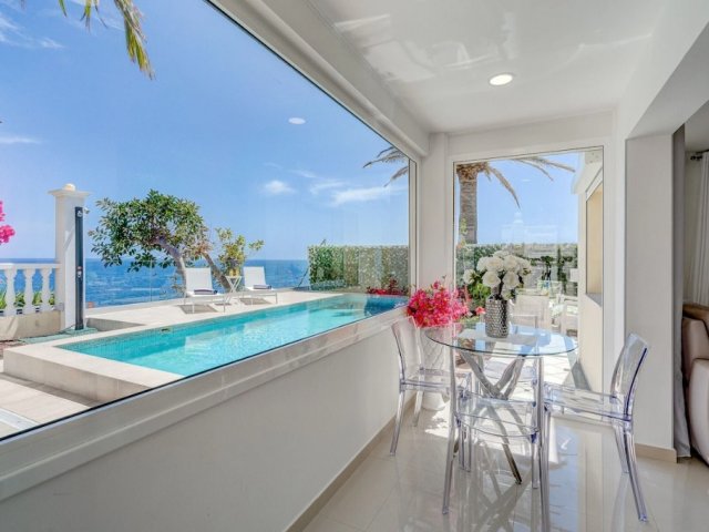 Stylish 3-bed villa in Amarilla Golf with heated pool, panoramic ocean views, garden, air-con, and a seafront terrace just steps from Playa El Barranco.