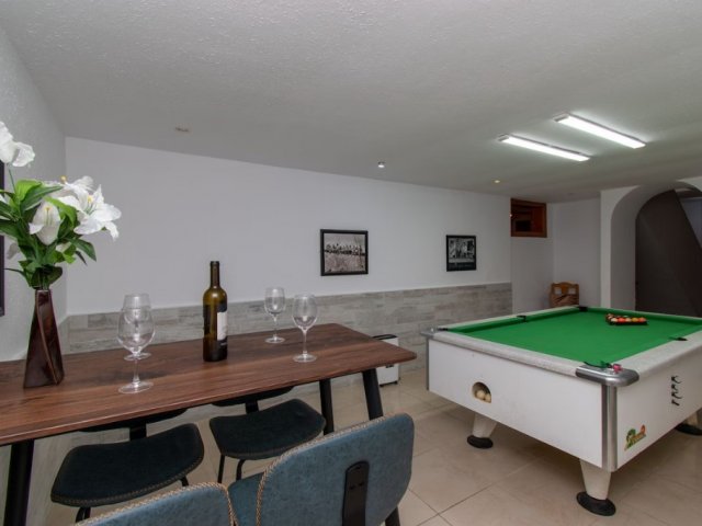 Spacious 4-bedroom holiday villa with a large pool, games area, outdoor dining, private parking, and walking distance to beaches, golf, restaurants and shops.
