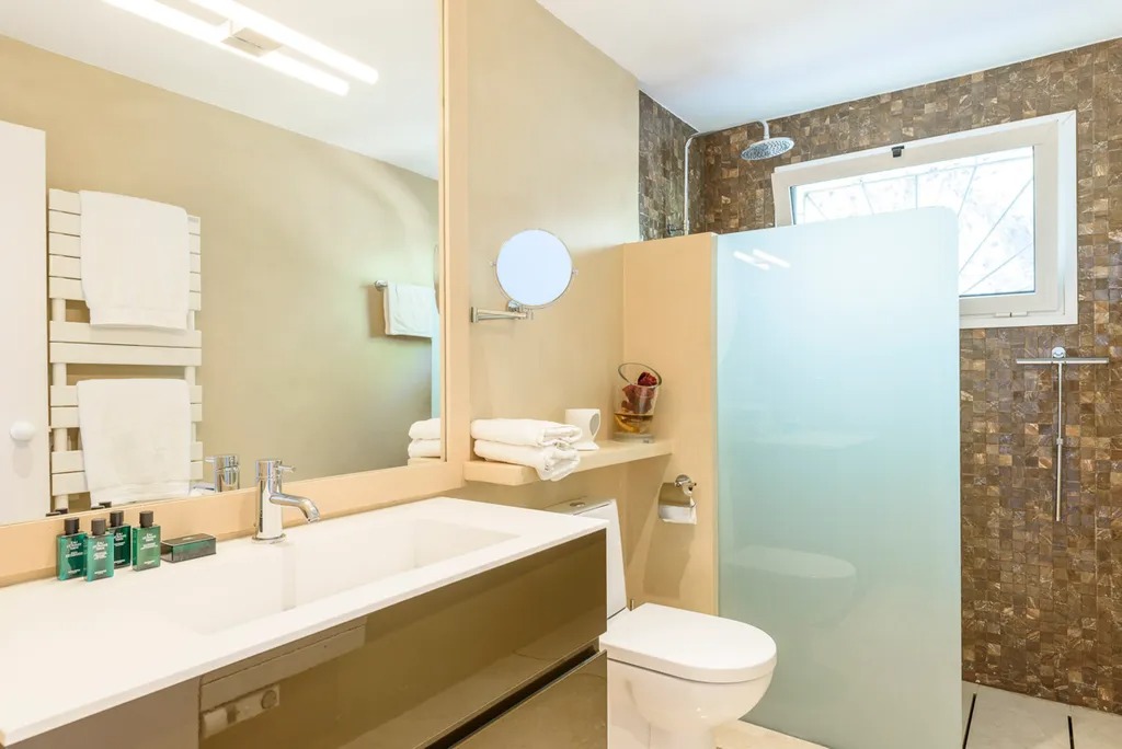 Ground Floor: - Spacious living room with satellite TV, fireplace, and terrace access - Open-plan dining area for eight guests with terrace access - Fully equipped kitchen with breakfast bar, central island, wine fridge, and terrace access - Master bedroom with double bed, terrace access, and ensuite bathroom with bathtub and walk-in shower - Bedroom with double bed, en-suite shower, and exterior access - Bedroom with double bed, en-suite shower, and exterior access