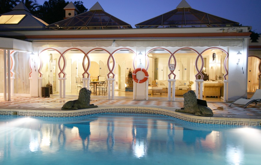 The outdoor space is extensive, with a 12 x 8 m pool featuring a wide entrance staircase flanked by bronze lions and a decorative fountain. The gardens include various bronze and stone sculptures, enhancing the sense of relaxation. The property offers a range of activities, including a private tennis court, basketball hoops, mini-soccer goals, darts in the pool area, badminton, and a large gas barbecue for outdoor dining.