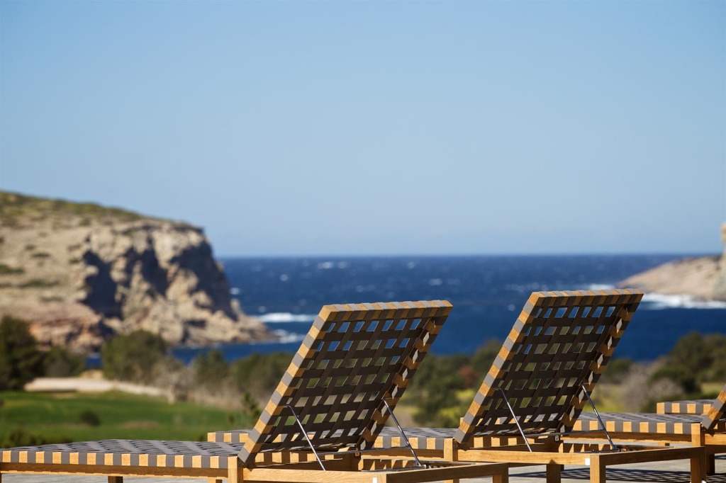 Designed by Monica Fullana and Jordi Carreno, this exceptional residence exemplifies luxury. Situated within a new, exclusive gated compound on the island's beautiful west coast, the villa enjoys a prime frontline location. Guests can enjoy magnificent sea views, including the islands of S'illa des Bosc and Conejera, as well as the famous Balearic sunset. The property combines sandstone, white monolayer walls, limestone floors, oak fittings, esparto, wood, and linen, blending traditional Ibizan style with modern technology.