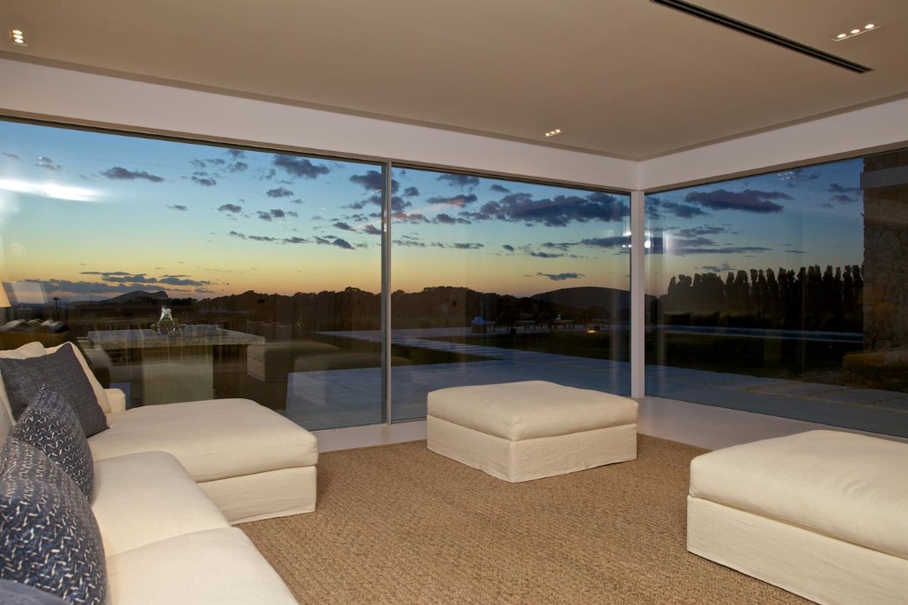 Glazed walls seamlessly merge the expansive indoor living areas with the outdoor terraces and lawns. The property is completely private with uninterrupted views. The long saltwater pool is bordered and shaded to one side by tall trees, with a wide sun terrace offering panoramic vistas of the landscape and sea.