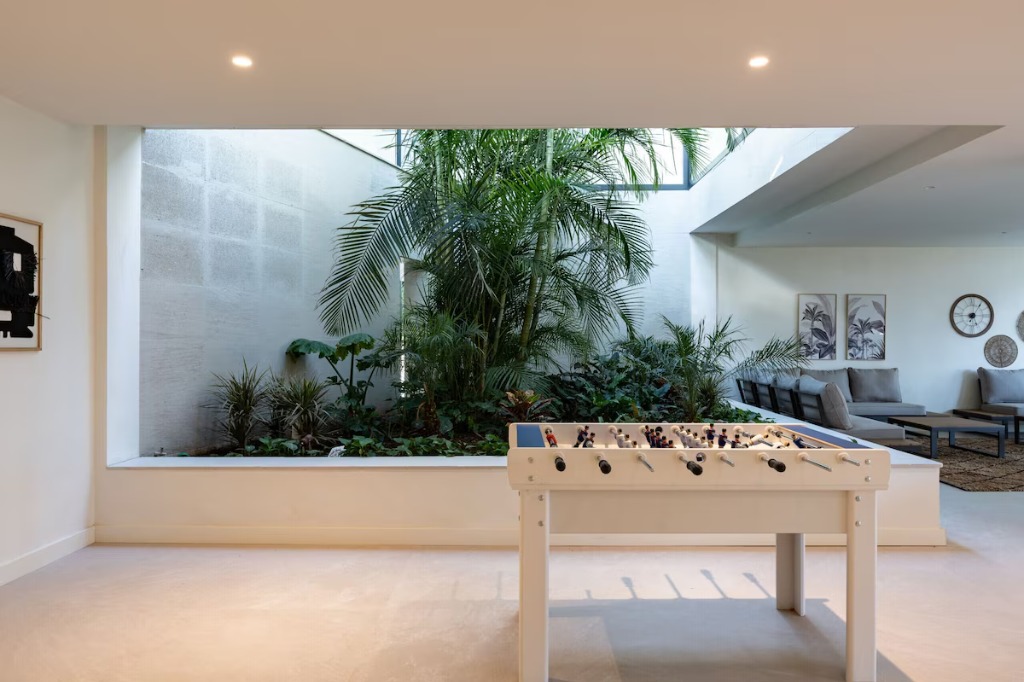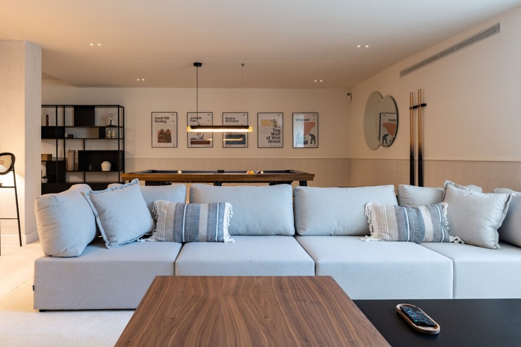 The lower ground level features an additional double bedroom with an en-suite bathroom. This level also includes a games and entertainment room equipped with a cinema area, bar with traditional seating and a pool table. An inviting outdoor space on this level offers an open-air gym and a comfortable outdoor living area suitable for relaxation or socialising.