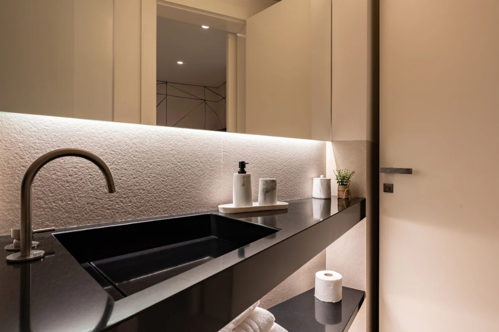 The accommodation is arranged over multiple levels and can host up to eight guests across five bedrooms. Each bedroom is individually designed and furnished to a high standard. All bedrooms are equipped with king-size beds and en-suite bathrooms.