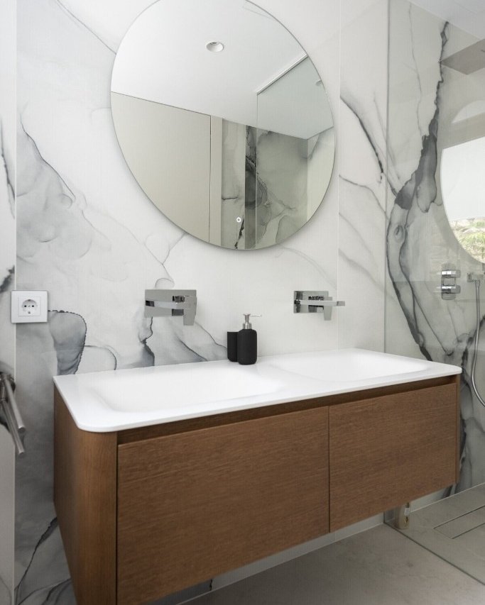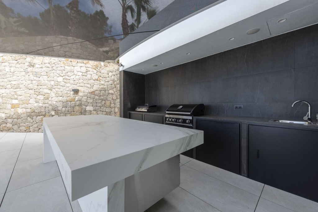 The main floor offers a generous open-plan living area with comfortable sofas, an elegant dining space and a fully equipped induction kitchen providing everything needed for home cooking, relaxed breakfasts or shared meals with loved ones. Large sliding glass doors open directly onto the expansive terrace, where panoramic views of the Peñón de Ifach create a spectacular backdrop for sun-soaked days. Here, the infinity pool, stylish sun loungers and a built-in barbecue make outdoor living effortless and unforgettable.