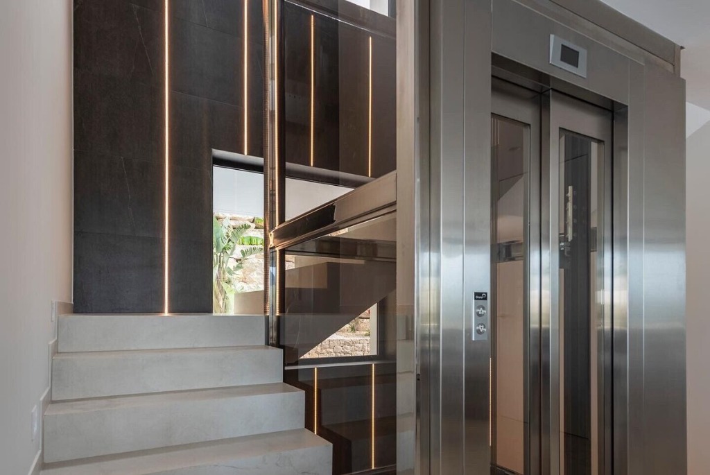 A glass elevator connects all levels of the home, adding both comfort and a touch of sophistication. On the upper floor, guests will find three luxurious bedrooms, each featuring a king-size bed, an en-suite bathroom and direct access to elevated views. The top floor can also be reached via stairs or lift, ensuring convenience for all guests across every level of the villa.