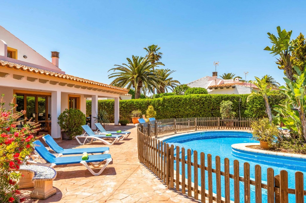 This charming holiday villa in Calan Bosch, Menorca, offers a perfect family getaway with a large pool, nearby beaches, and easy access to the vibrant marina.